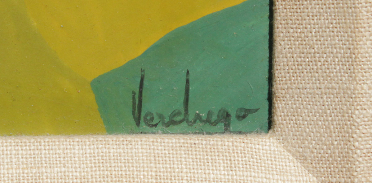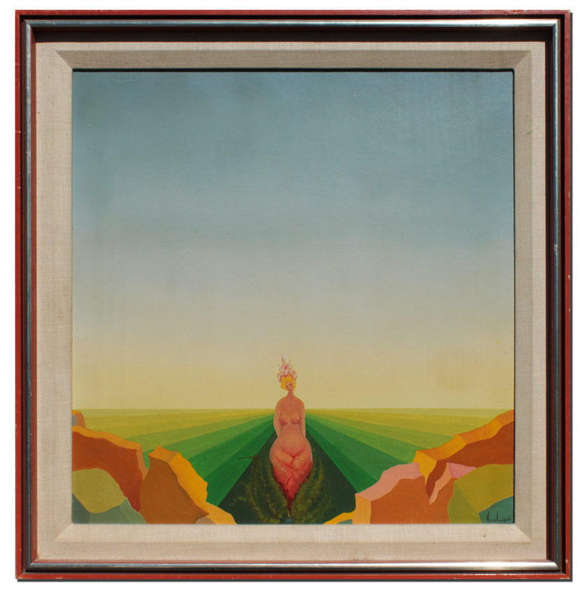 VERDUGO, Fernando, (Spanish, 1942-): Surreal Scene with Nude Female Apparition, Oil/Board, Sight size 18'' x 18'', signed lower right, custom frame with wear, 22 1/4'' x 22 1/4''.