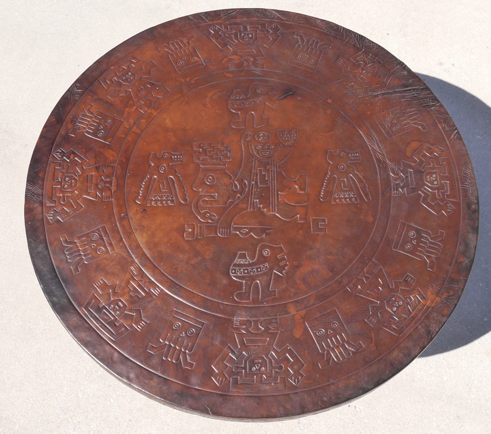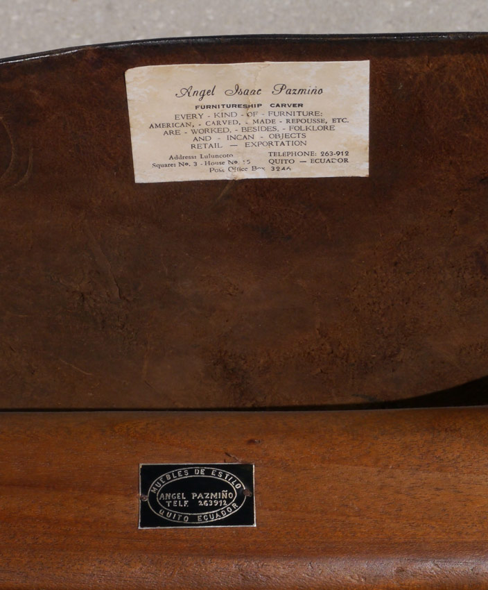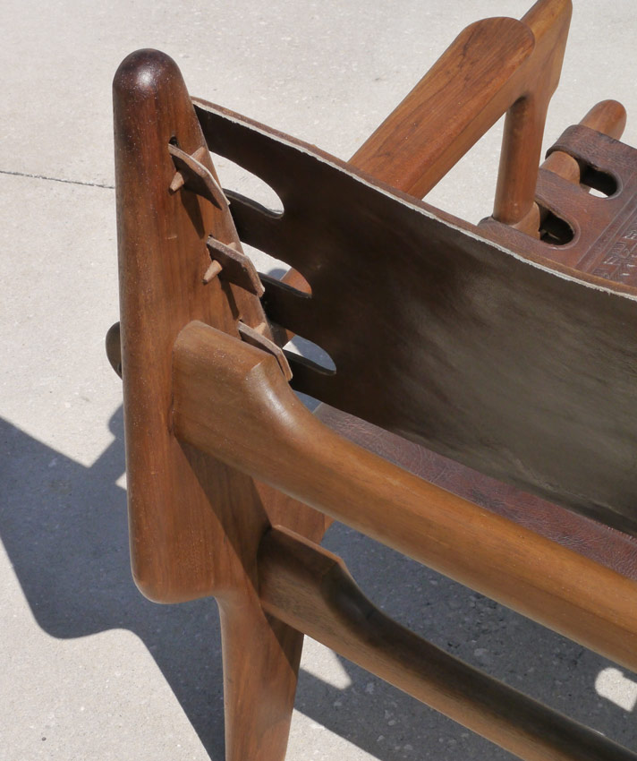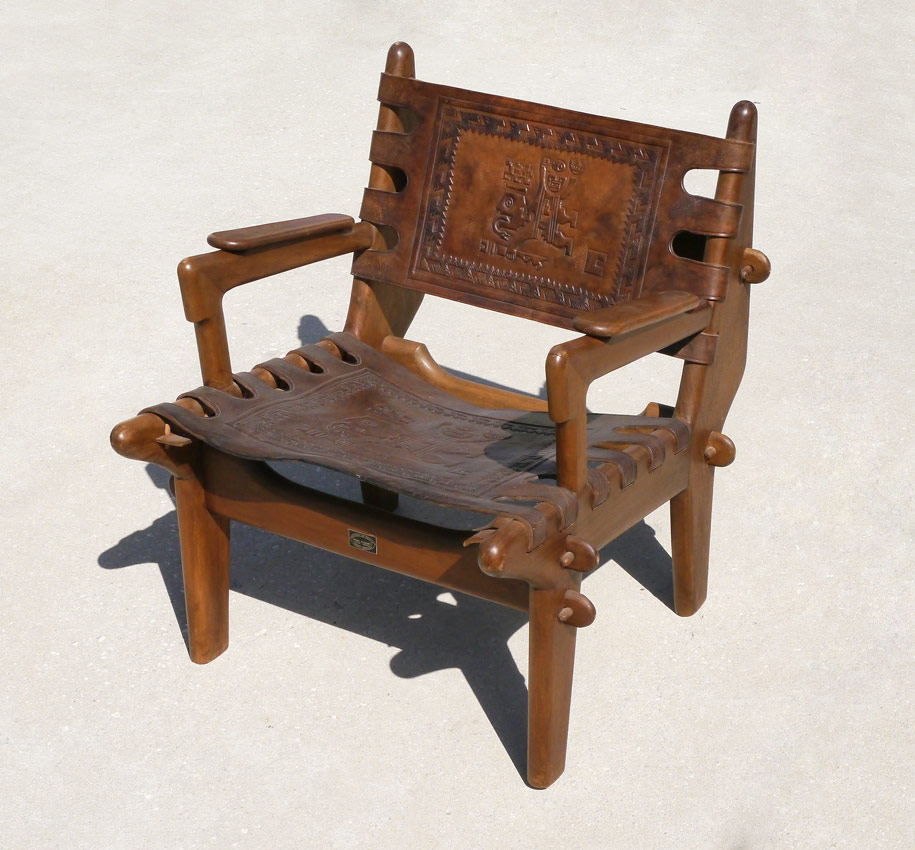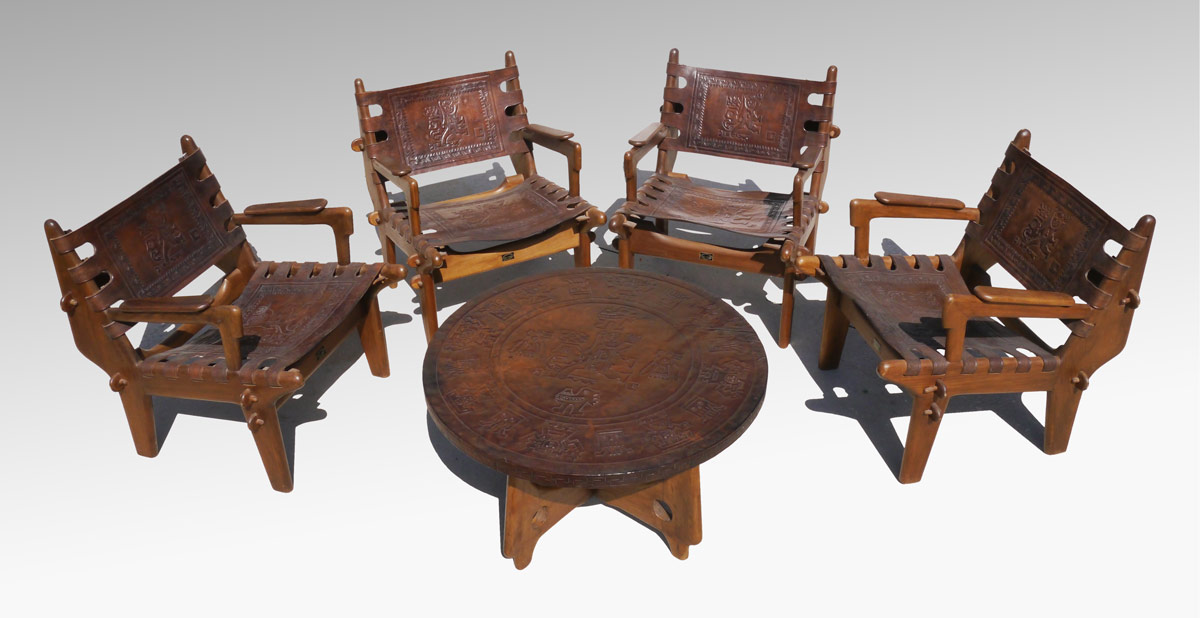 ANGEL PAZMINO MUEBLES DE ESTILLO ECUADORIAN FURNITURE: Set of 4 arm chairs and a low table. Tooled leather and teak. Table measures 20 1/2'' h. x 33 1/2'', chairs 30 1/2'' h. x 24 1/4'' x 29 1/2''.