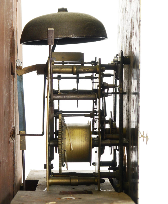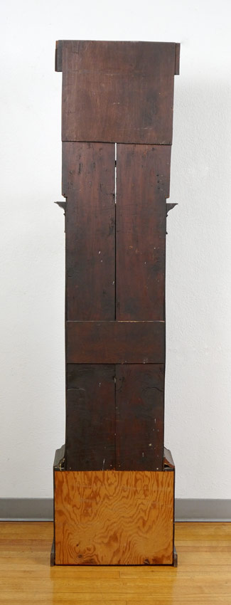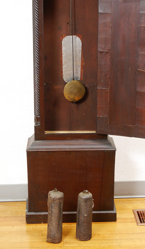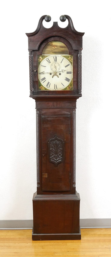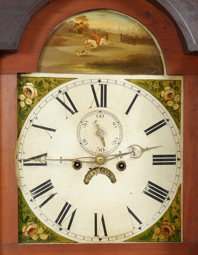 ENGLISH MAHOGANY LONG CASE CLOCK: Bonnet with broken arch pediment, turned full column supports. Mahogany veneer case with carved quarter columns, applied decoration on door. Painted metal dial with fox hunt scene, Roman numerals, second and date dials. Crank and pulleys in office. 83'' h. x 18 3/4'' x 8 3/4''.