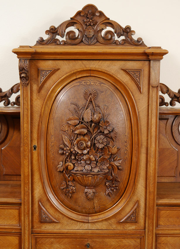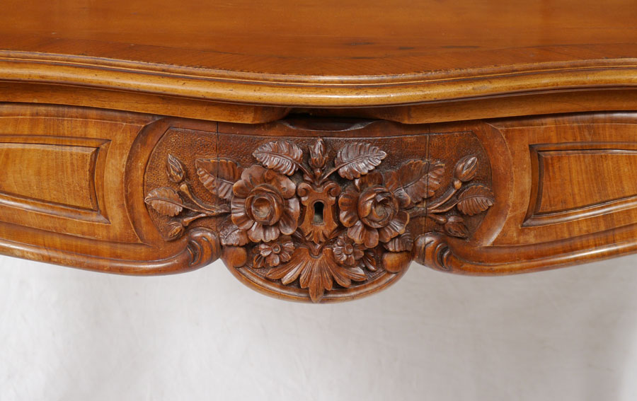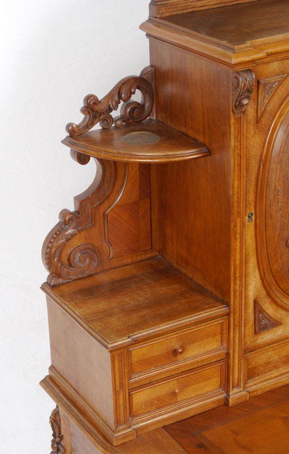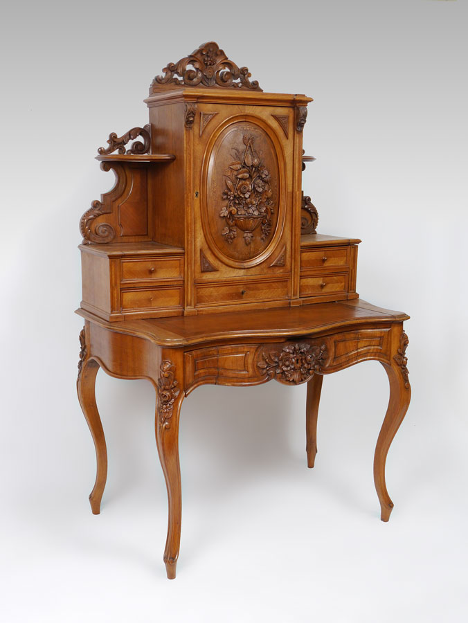 CONTINENTAL CARVED LADIES DESK: Top with carved crest, central door with relief carved bouquet of flowers in panel, 2 candle shelves, 2 side drawers on either side of lower central drawer. Base with leather writing surface over single full length drawers, carve and shaped legs. Overall 65 1/2'' h. x 24 1/2'' x 36 3/4''.