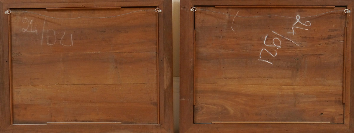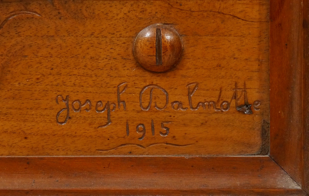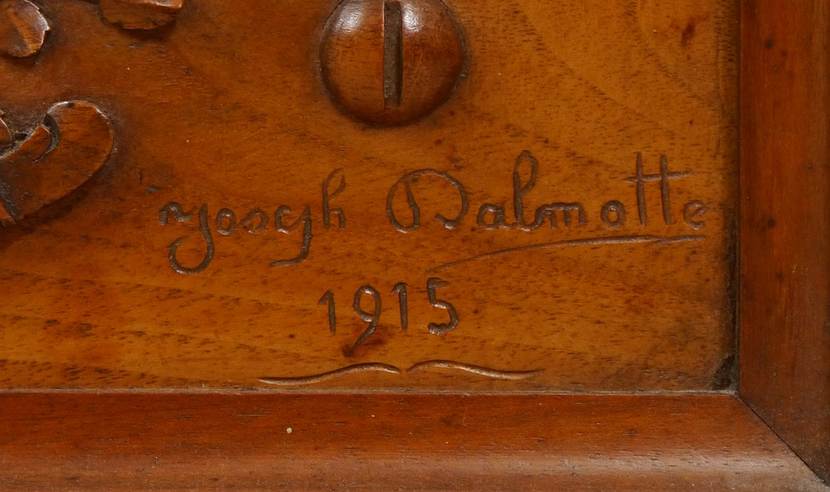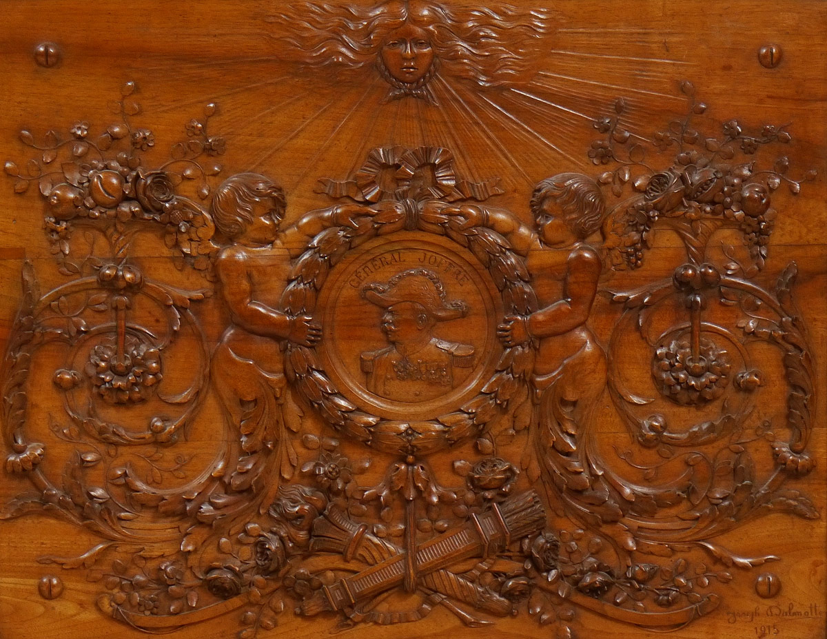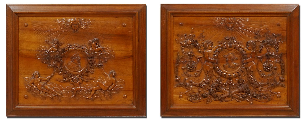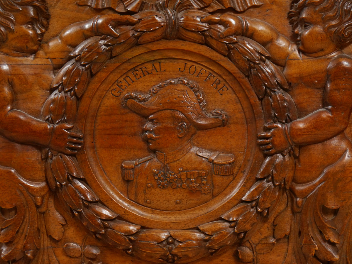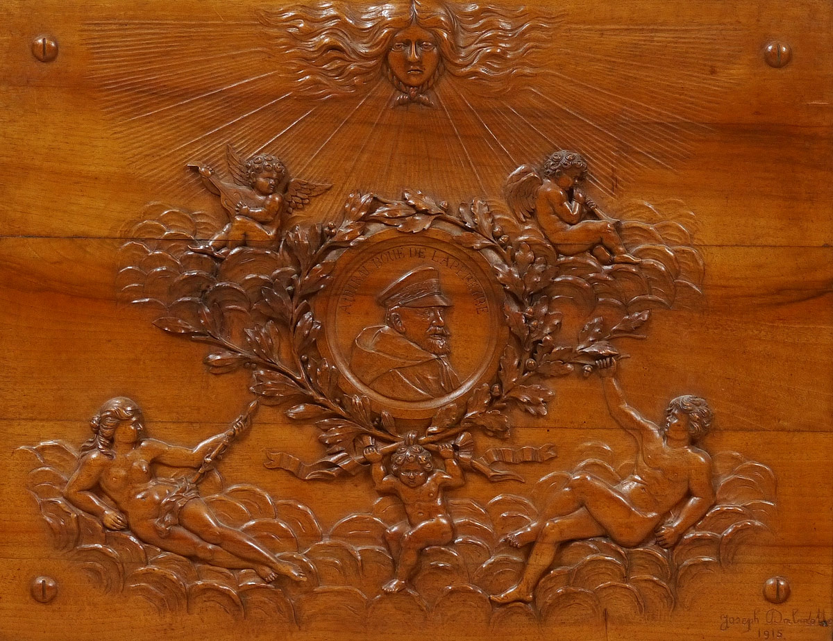 PAIR 1915 FRENCH CARVED WOOD MILITARY PLAQUES: Both signed Joseph Dalmotte and dated to include 1) Central medallion carving of French Admiral Boue de Lapeyrere (spelled Lapereyre on plaque) surmounted by wreath, cherubs, putto, figures and masqueron. 25 1/2'' x 31 1/2'' 2) Central medallion carving of French General Joseph Joffre surmounted by figural putti, masqueron and foliate scroll. 25 3/4'' x 31 1/2''.