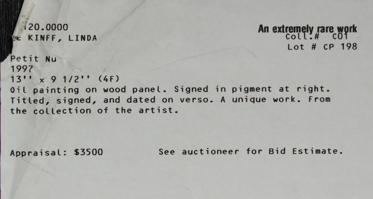 LE KINFF, Linda, (French, 1949- ): ''Petit Nu'', Oil/Wood Panel, 13'' x 9 1/2'', signed in the right margin, signed and titled verso, framed 19 1/4'' x 15 1/2''.