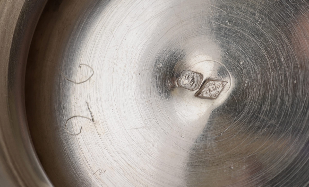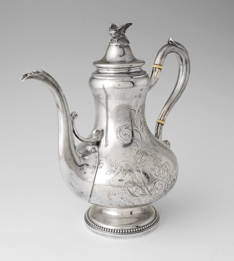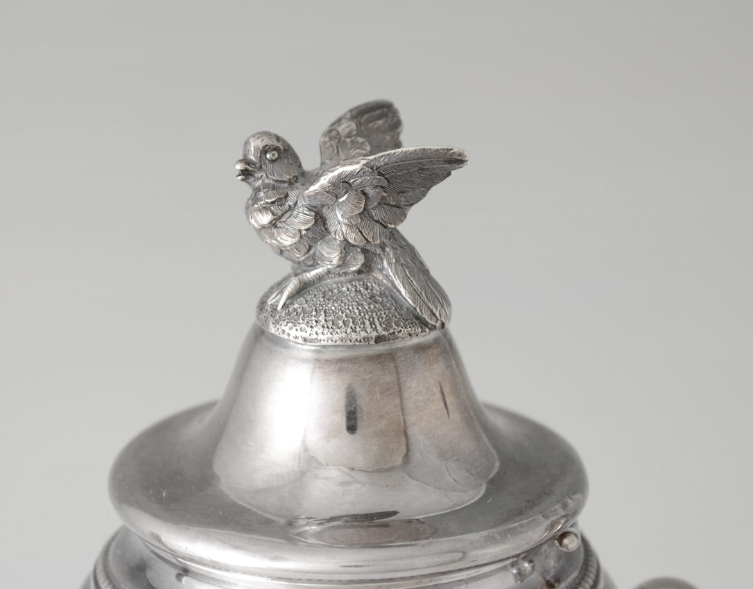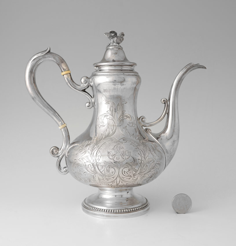 AUGUSTE L. FIZAINE FRENCH SILVER TEAPOT: Engraved French teapot by Auguste Fizaine with French Minerva 950 silver hallmark. Bird finial on hinged lid, foliate engraved body with monograms. 9'' h. x 9 1/4'', approx. 14.4 troy oz.