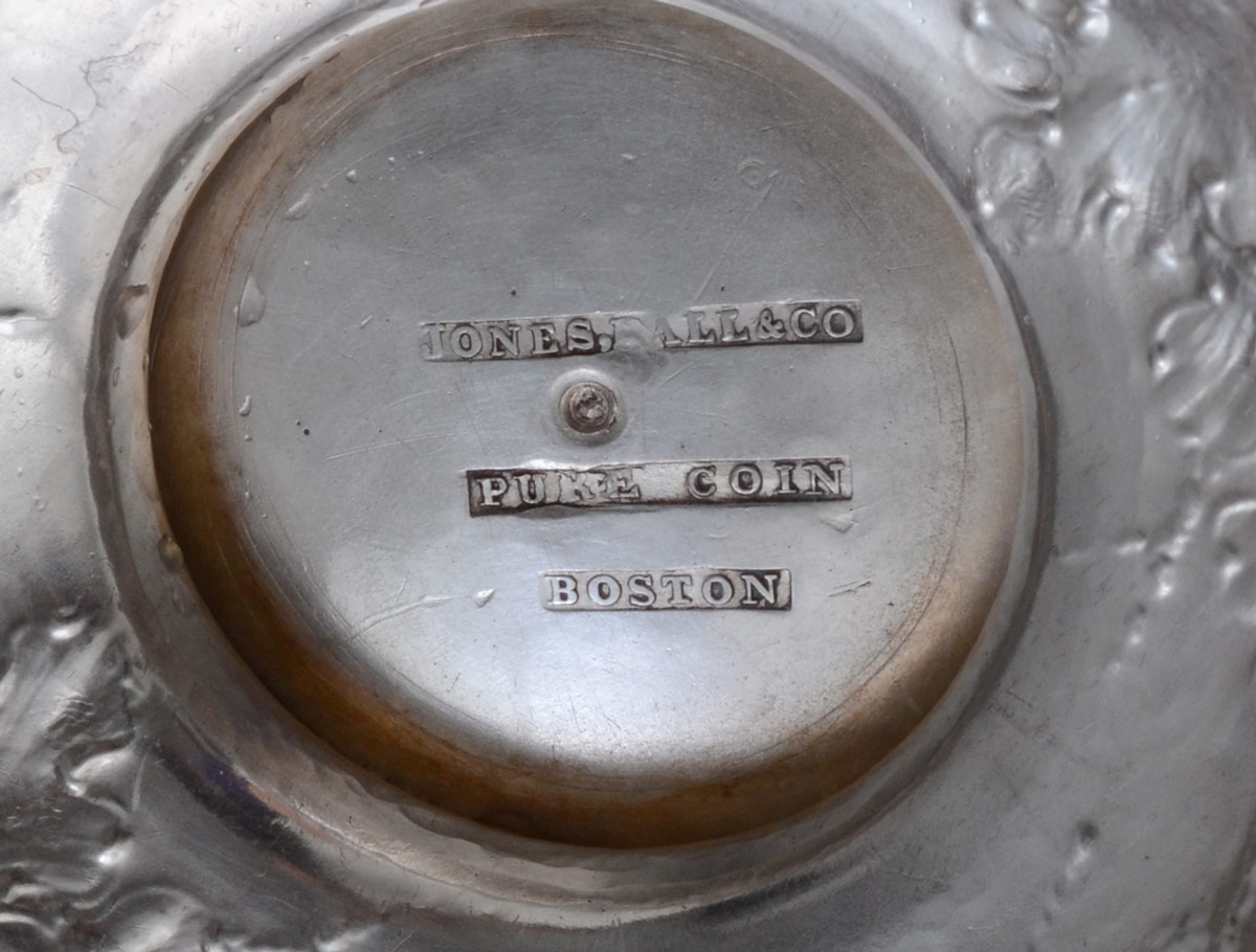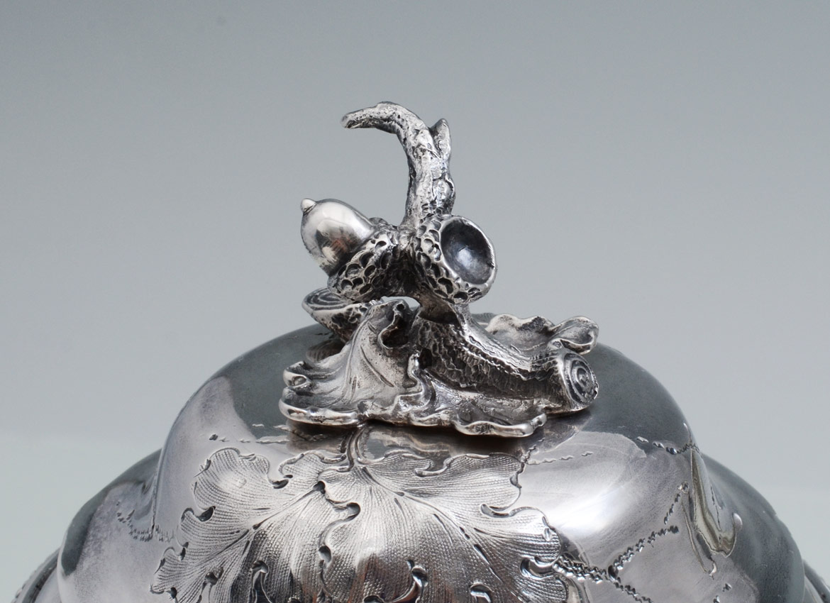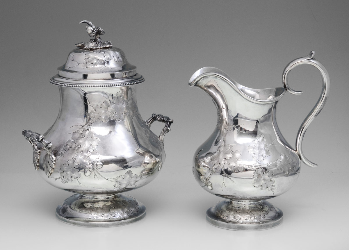 JONES, BALL & CO. COIN SILVER SUGAR & CREAMER: Embossed and engraved oak leaf and acorn motifs. Both marked Jones, Ball & Co., Pure Coin, Boston. To include 1) Covered sugar, lid with acorn finial, 7 3/4'' h. x 6 1/4''. 2) Open creamer 7'' h. x 5 1/2''. Approx. 28.0 troy oz.