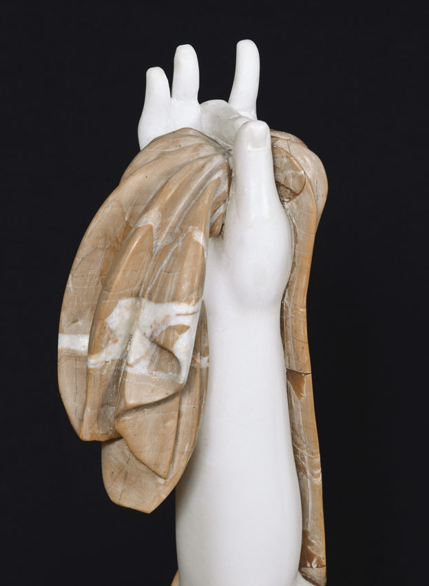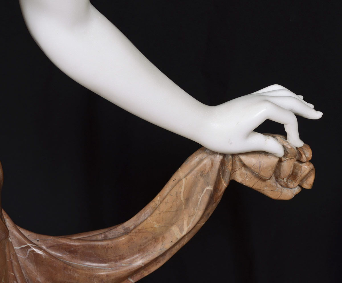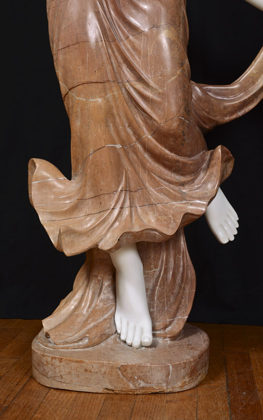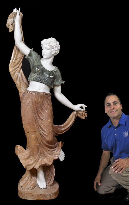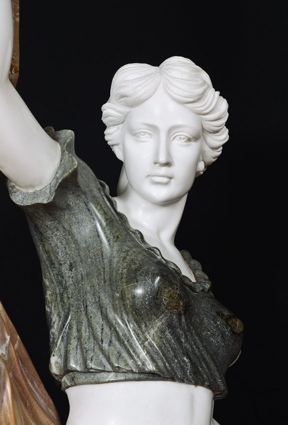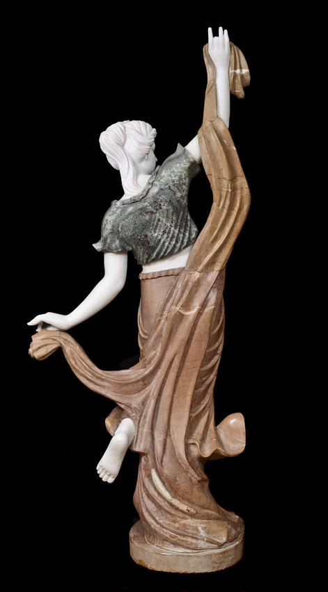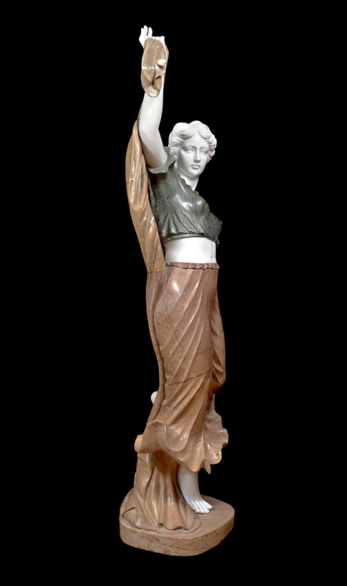 NEAR LIFE SIZE SCULPTURE OF A GYPSY DANCER TRI COLOR MARBLE: Overall height is 65''.