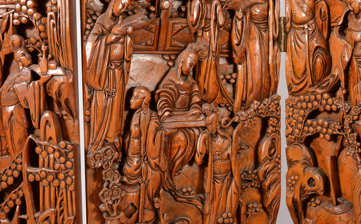 DEEPLY CARVED ORIENTAL 4 PANEL SCREEN: Intricate carved panels with double hinges. Rounded form, 6'4'' tall at the center panels. The panels measure 16 and 17'' wide. Surmounted by dueling dragons.