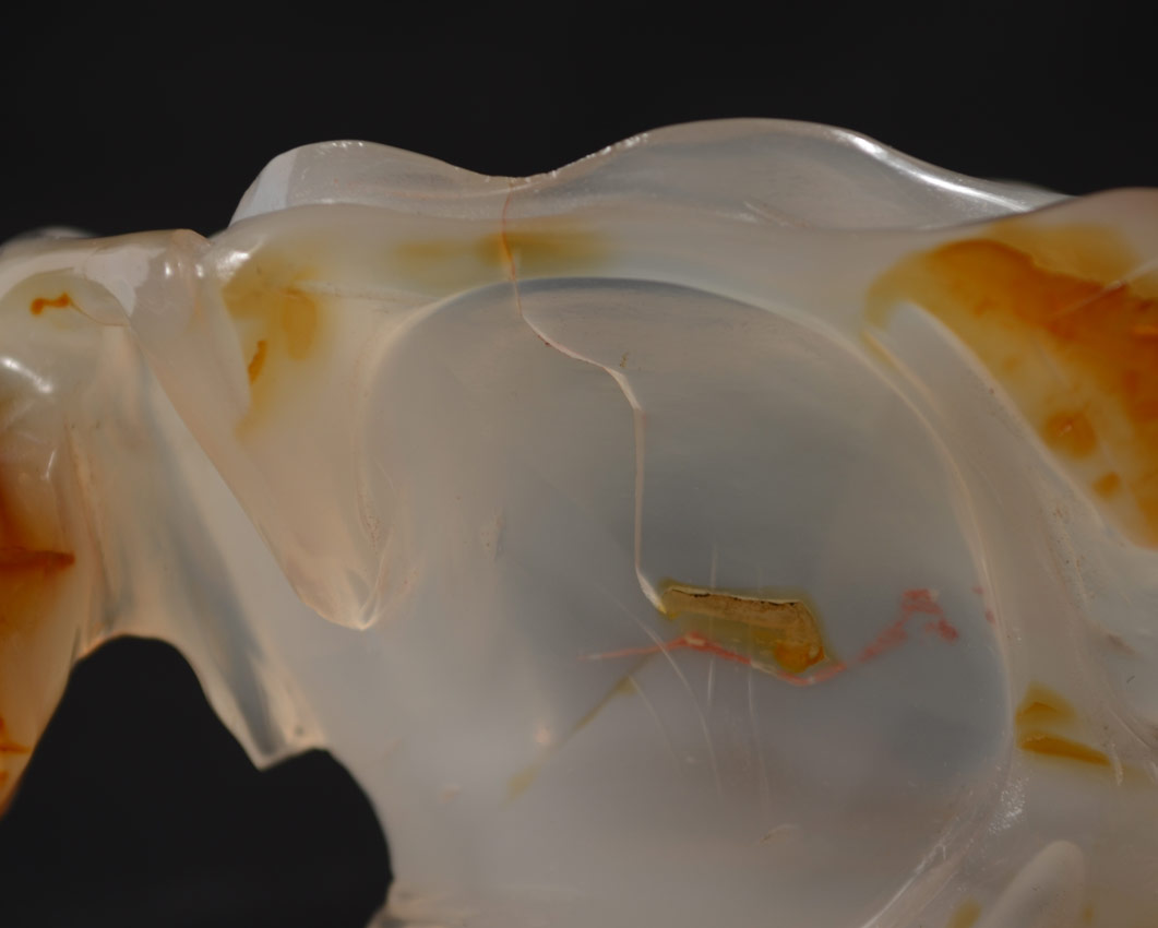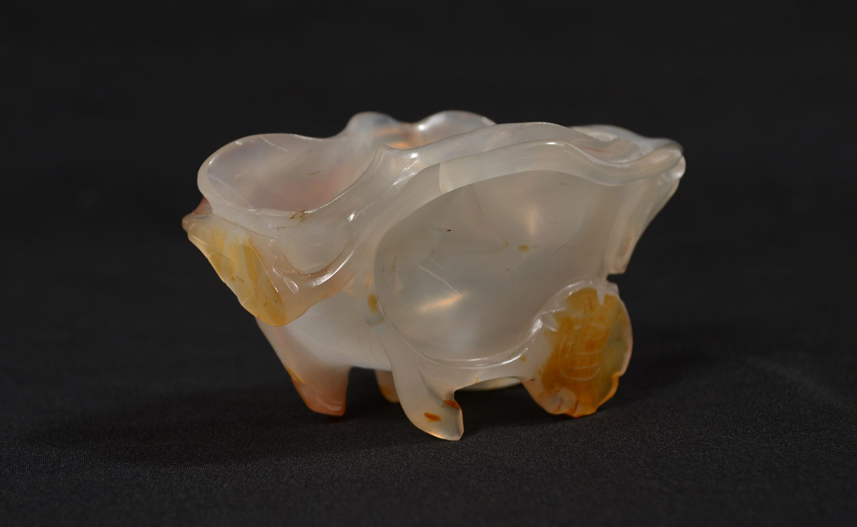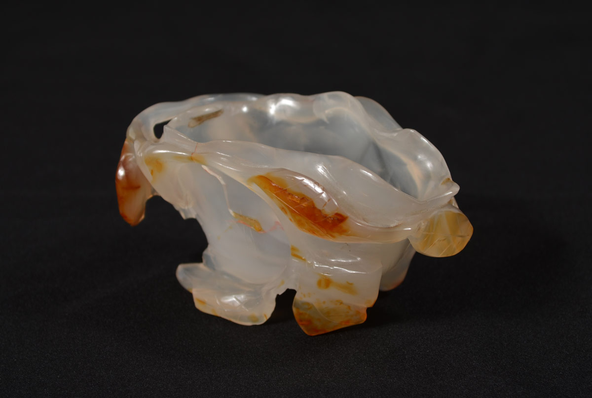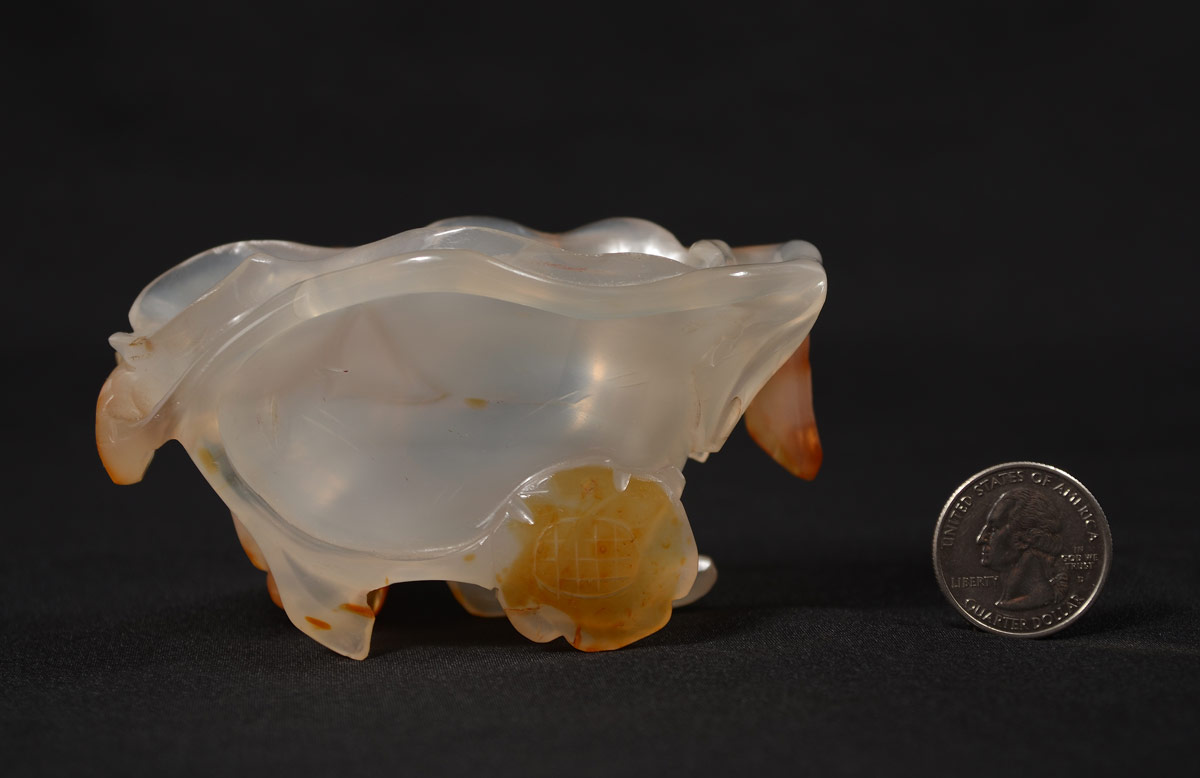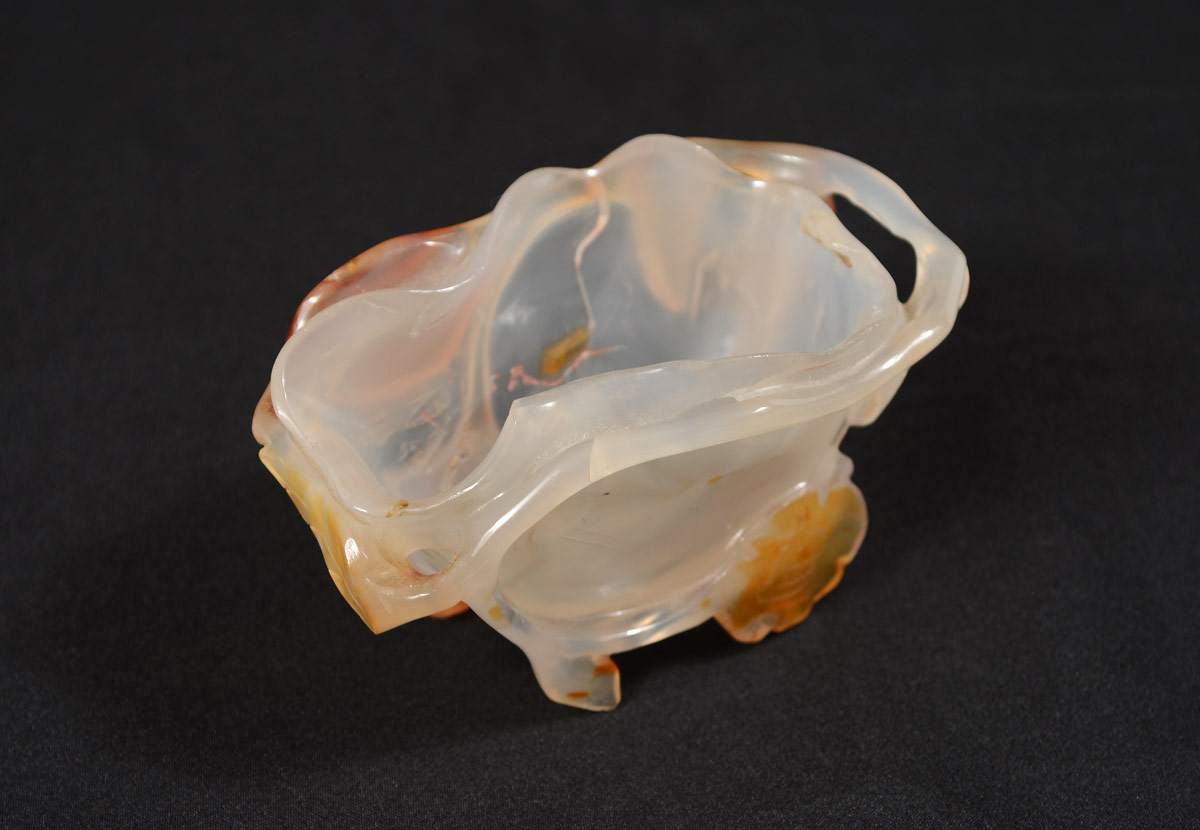 CHINESE CARVED STONE LIBATION CUP: White to clear hard stone, possibly jade, with amber highlights, carved with foliate motifs. Measures 2 1/2'' h. x 4'' x 2 5/8''.