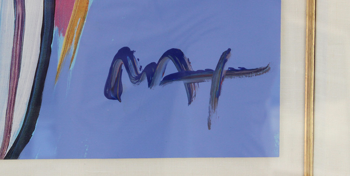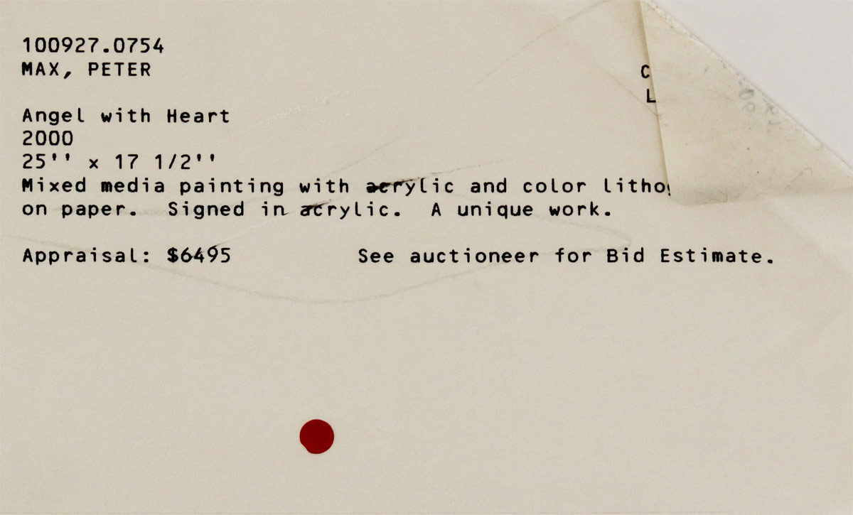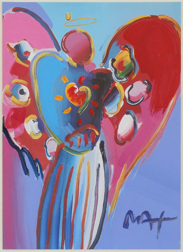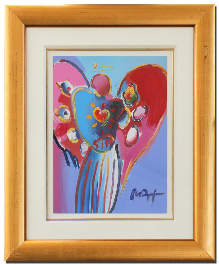 MAX, Peter, (German, 1937- ): Angel with Heart, Mixed Media Painting w/Acrylic and Color Lithograph on Paper, 25'' x 17 1/2'', signed lower right, encased in gilded custom frame with wear 38'' x 32'', original auction information affixed verso.