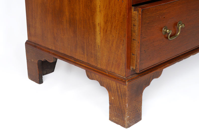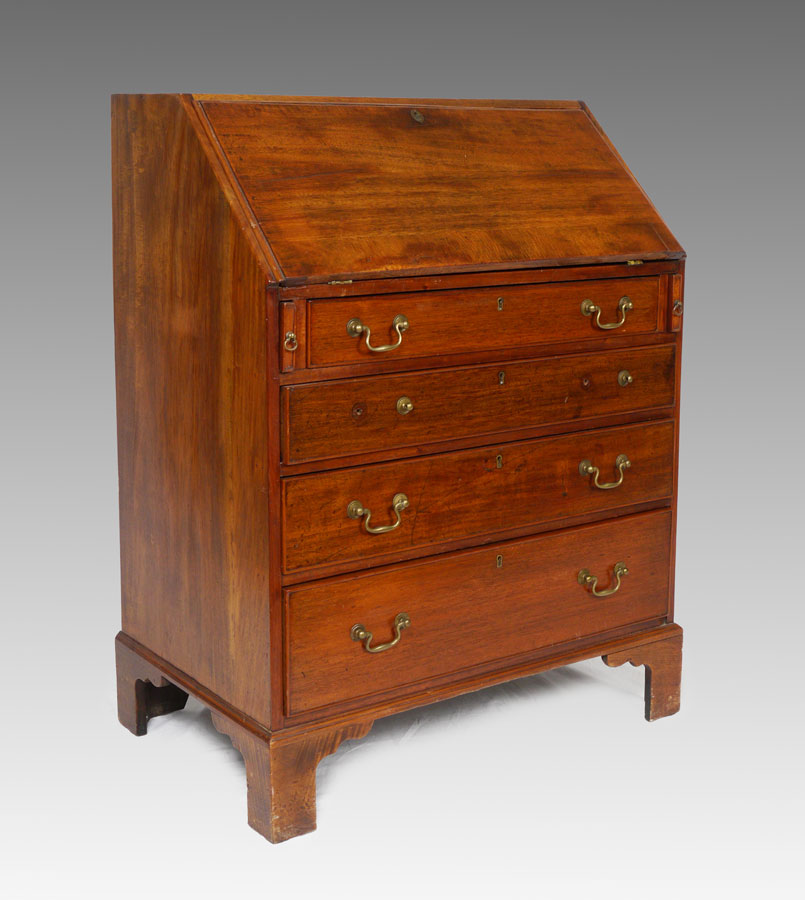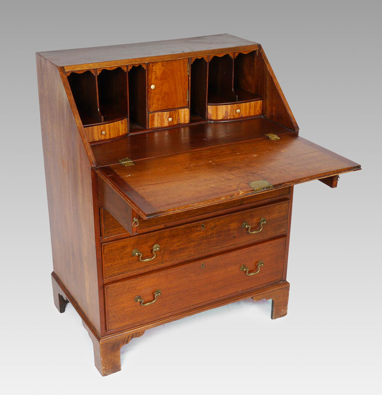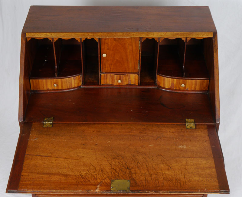 CHIPPENDALE STYLE SLANT FRONT DESK: 19th century, most likely English, slant front opens to reveal shaped drawers, single door, pigeon holes. 4 graduated drawers with brass pulls, on bracket feet. 39 1/4'' h. x 29 1/2'' x 19 1/2''.