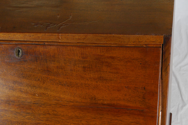 CONDITION: Note gouges on top, many scratches to interior of fall front, 2nd drawer missing pulls, other wear consistent with age and use.
