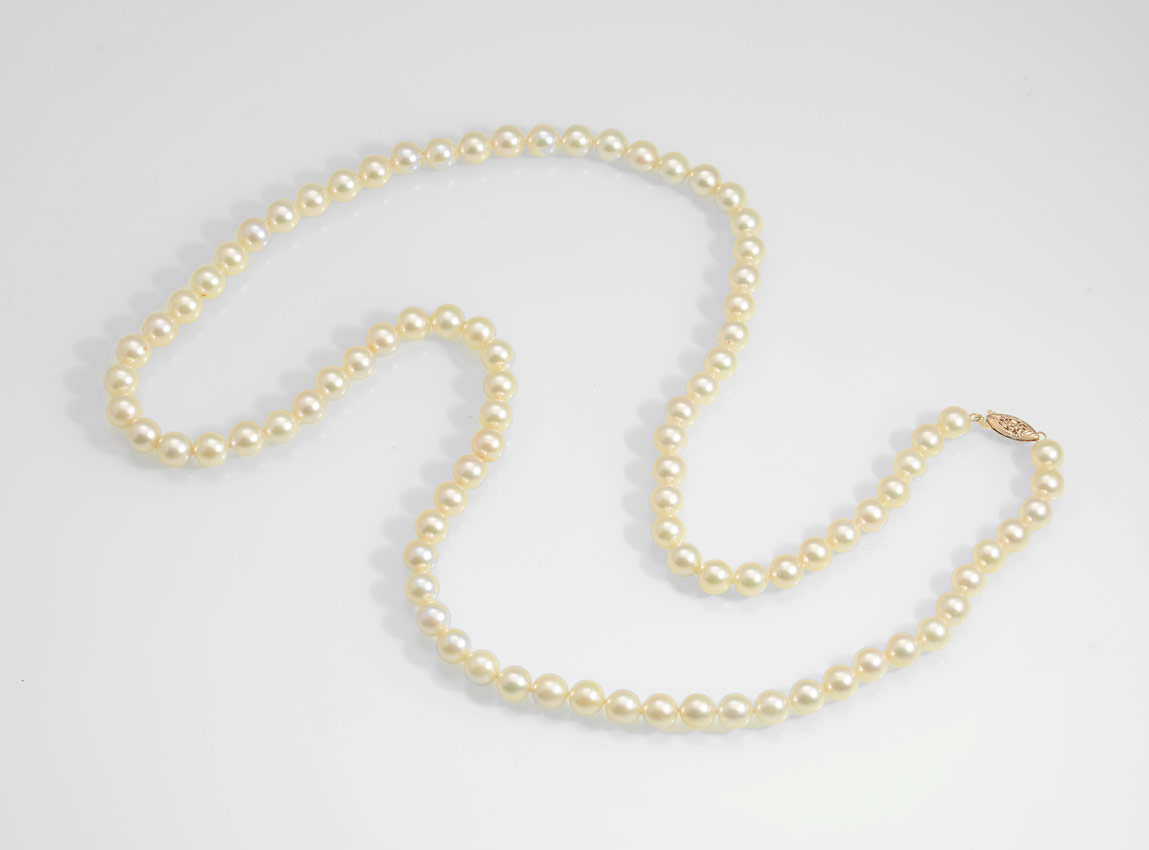 CULTURED PEARL NECKLACE: 30'' strand of cultured pearls, averaging 8.5 mm. gold rose luster. 14k yellow gold clasp.