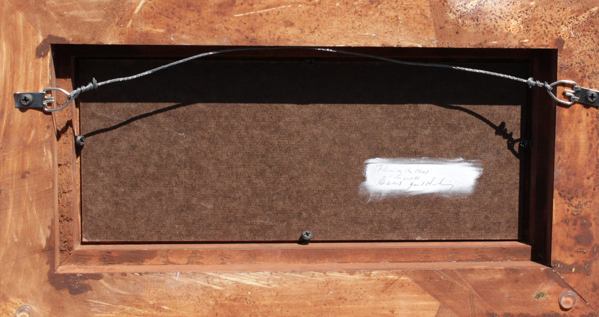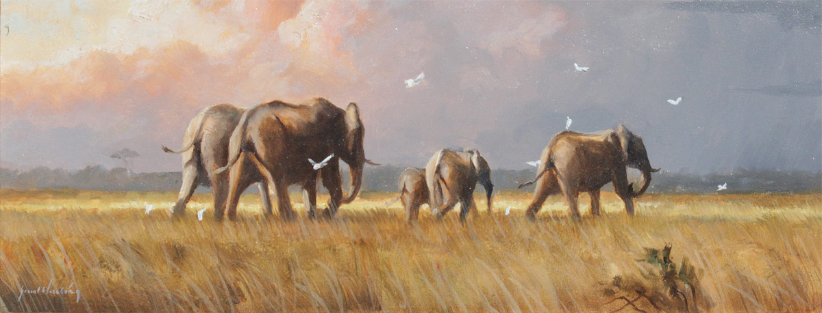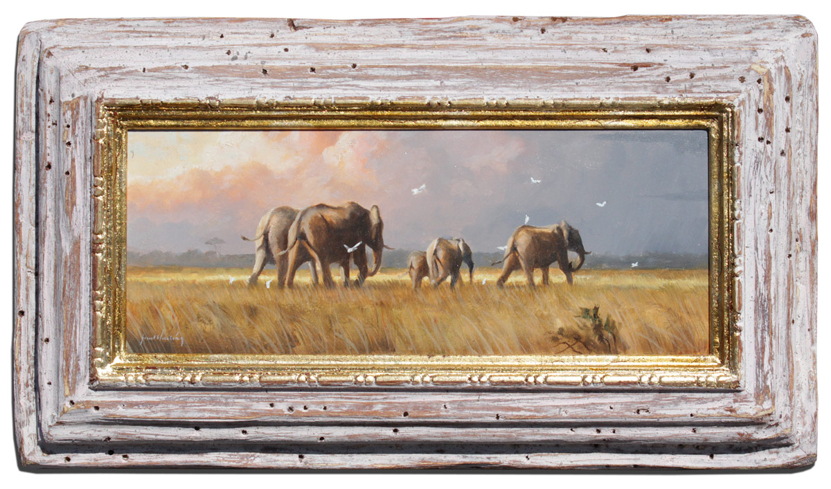 HACKING, Grant, (American, 1964- ): ''Following the Herd'', Depicts Pack of Elephants in an African Landscape, Oil/Masonite, 5'' x 12'', signed lower left, signed titled and dated 2013 verso, custom frame 9 1/4'' x 16 1/2''.