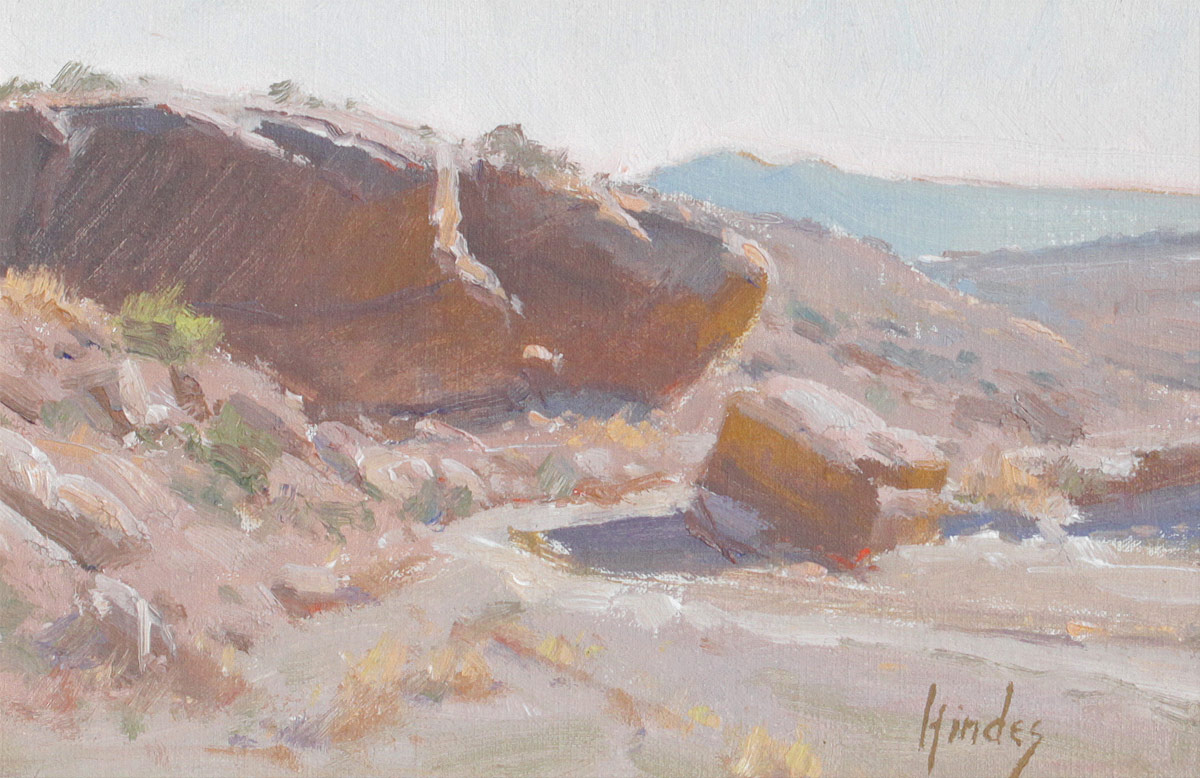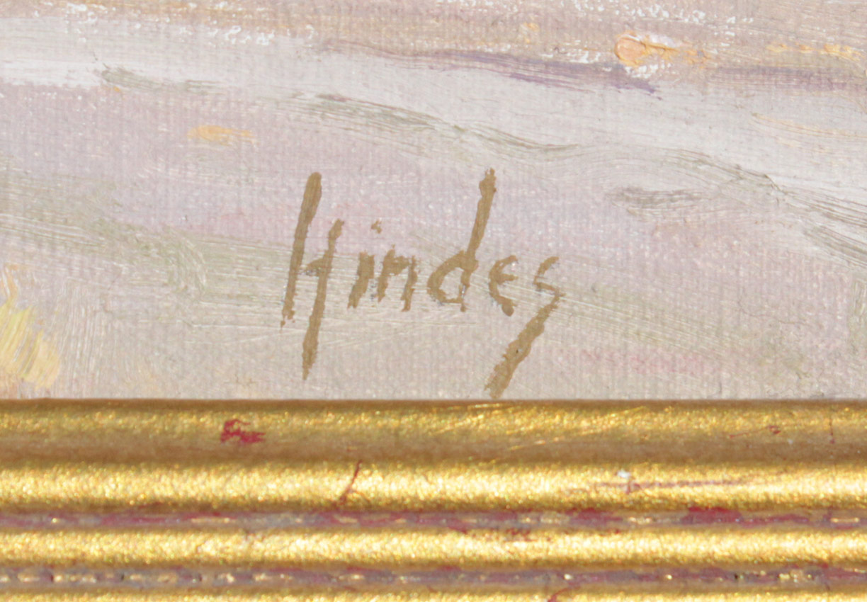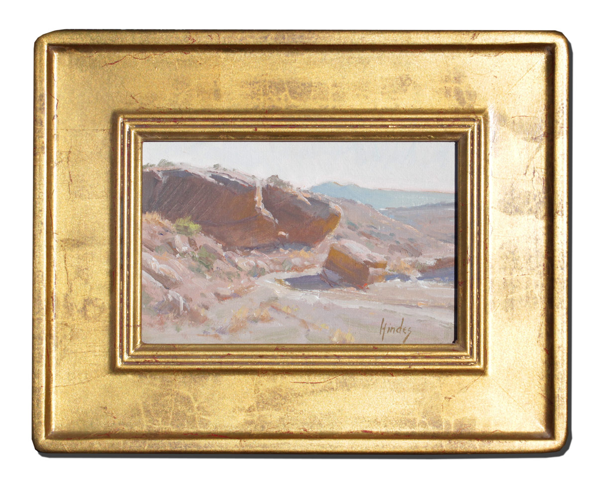HINDES, Janice Yow, (American, 20th/21st Century): Western Desert Canyon Scene, Oil/Canvas, mounted to board, 6'' x 9'', signed lower right, encased in custom gilded Glaser frame, 11 1/2'' x 14 1/2'', Green House Gallery Label affixed verso.