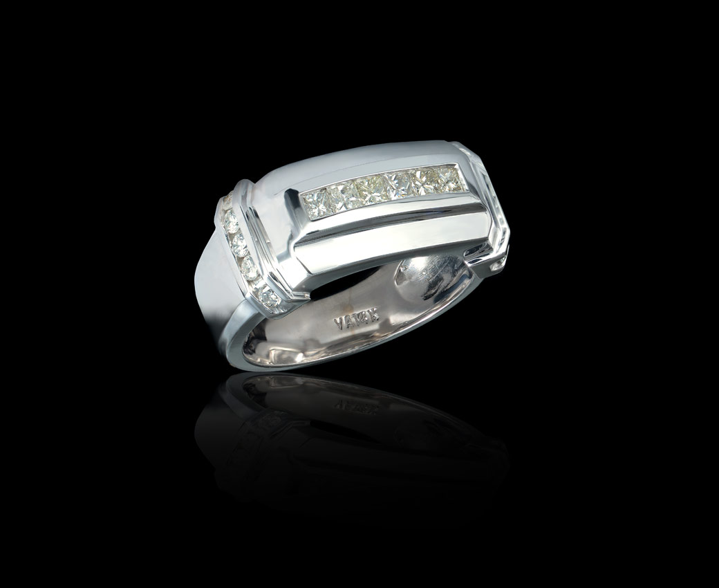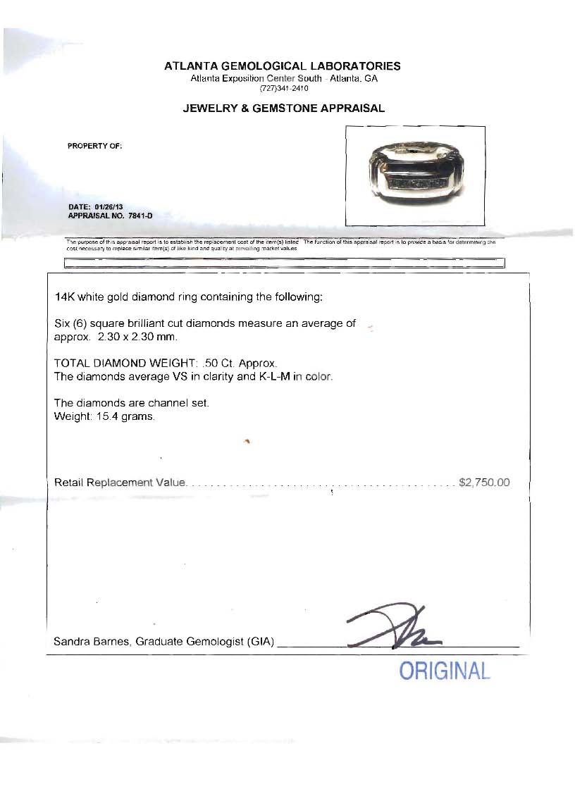 MEN'S DIAMOND RING: 14k white gold ring with 6 square brilliant diamonds totaling approx. .50 Ct., averaging VS clarity and K-L-M color. Channel set. Size 10. Weight 15.4 grams. Sold with current Atlanta Gemological GIA graduates appraisal for $2750.
