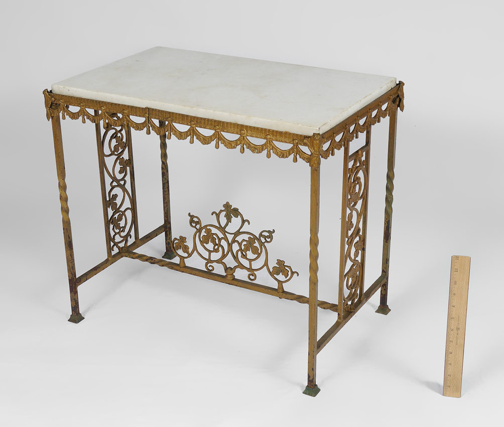 ART DECO ERA GILT IRON MARBLE TOP SIDE TABLE: Lovely worn condition. Please note the marble has lost its polish, 22'' high x 25'' x 15 1/2''.