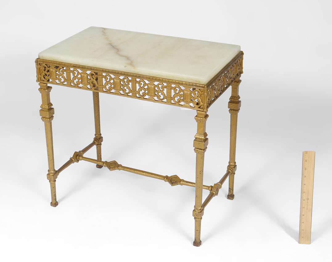 ART DECO ERA GILT IRON MARBLE TOP TABLE: 21 1/4'' high x 21'' x 13''