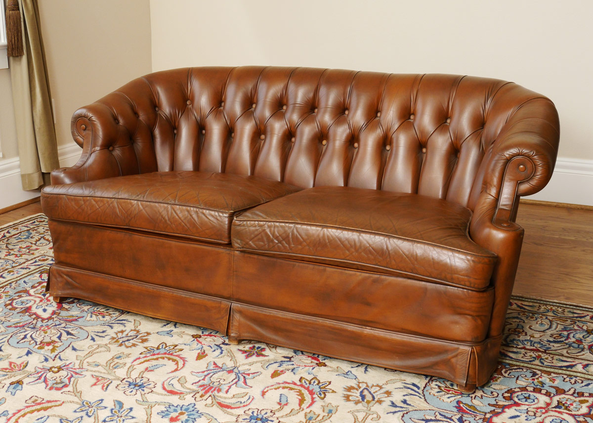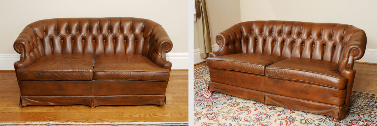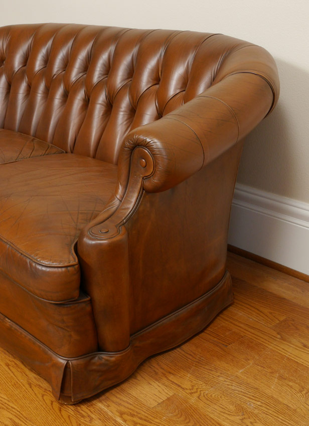PAIR CHESTERFIELD LEATHER LOVE SEATS: Each measures 29 1/2'' h. x 60 3/4'' x 34 1/2''.