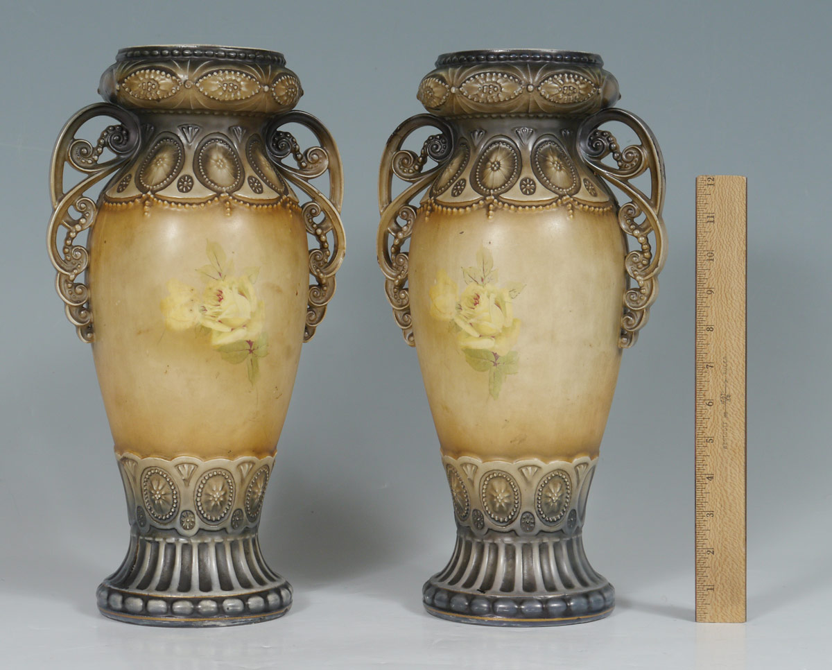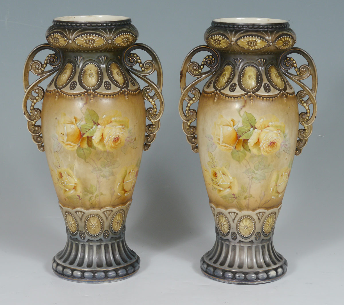 PAIR OF PAINTED ITALIAN PORCELAIN VASES: Reticulated handles, floral rose motifs on body of both. Unmarked. 15 1/2'' h. x 8''.