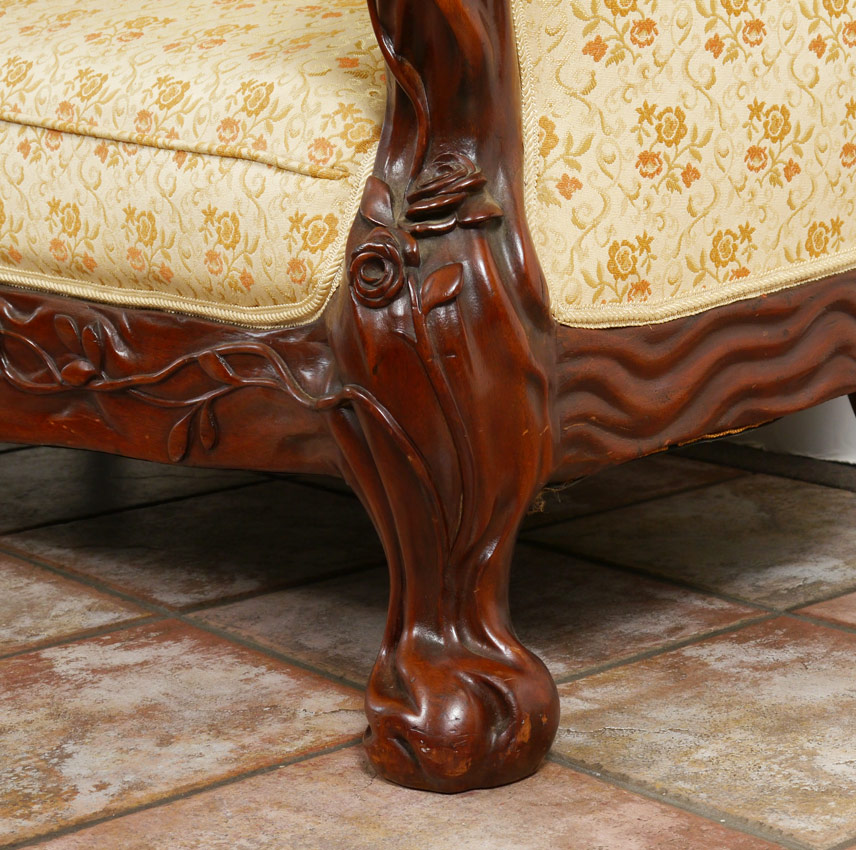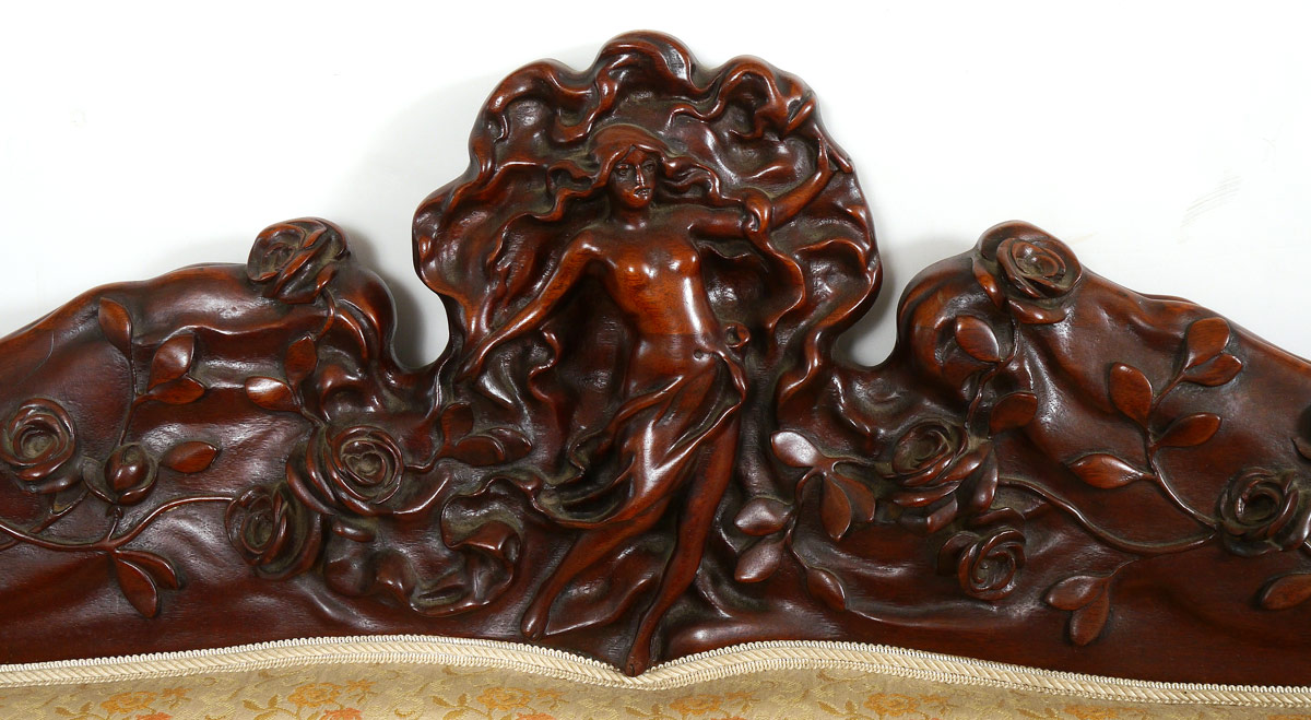 KARPEN CARVED ART NOUVEAU SETTEE: Attributed to Karpen or Tobey, frame carved overall with floral rose vine and art nouveau motifs. Crest with figural semi-nude maiden. Yellow floral upholstery. Overall measures 42'' h. x 59 3/4'' x 29 1/2''.