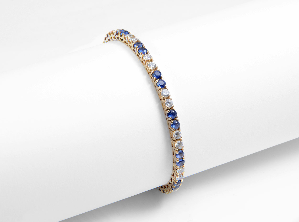SAPPHIRE TENNIS BRACELET: 14K yellow gold line bracelet alternates synthetic blue sapphires and cubic zirconia to create a look great for everyday or special occasions. Length 7''. Weight 9.9 grams.