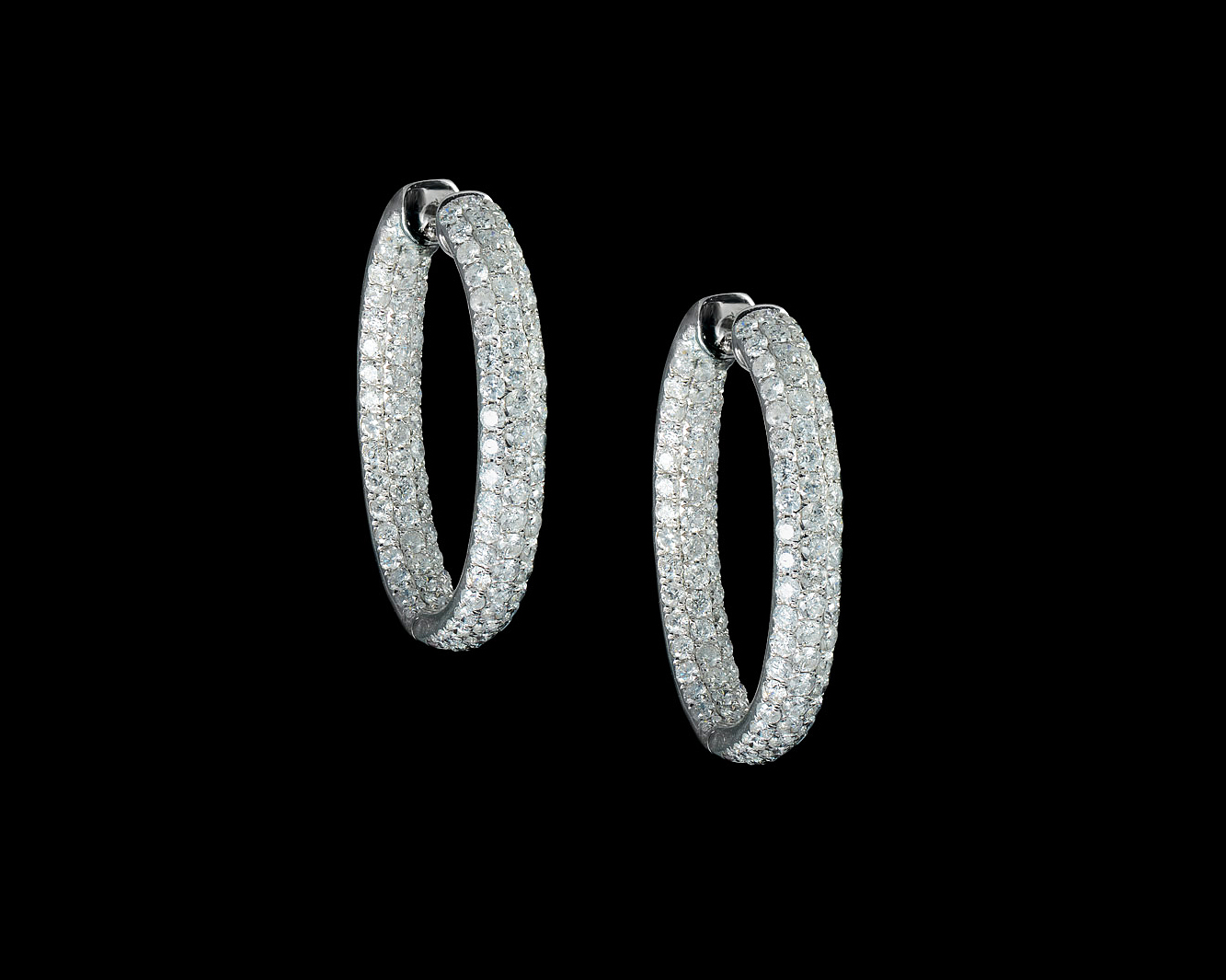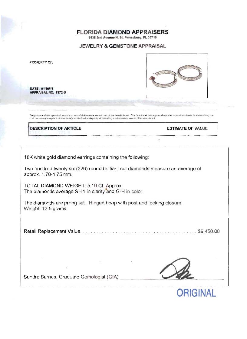 5.10 CTW DIAMOND HOOP EARRINGS: 18K white gold hinged hoop earrings of 226 round brilliant diamonds totaling approx. 5.10 Ct., averaging SI-I1 clarity and G-H color. Prong set. Post and locking closure. Diameter: 1''. Weight: 12.5 grams. Sold with current Florida Diamond Appraisers GIA graduates appraisal for $9,450.