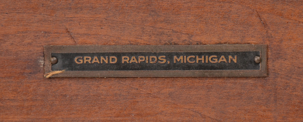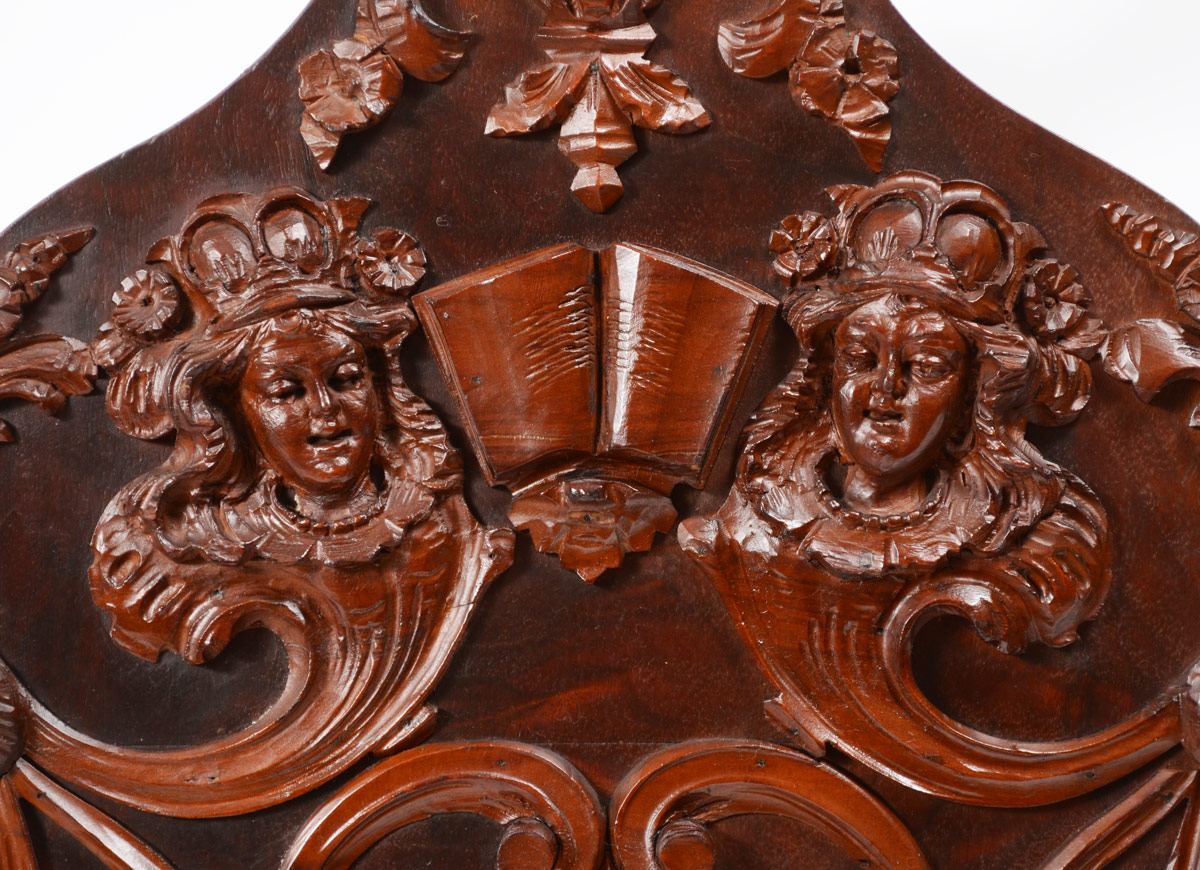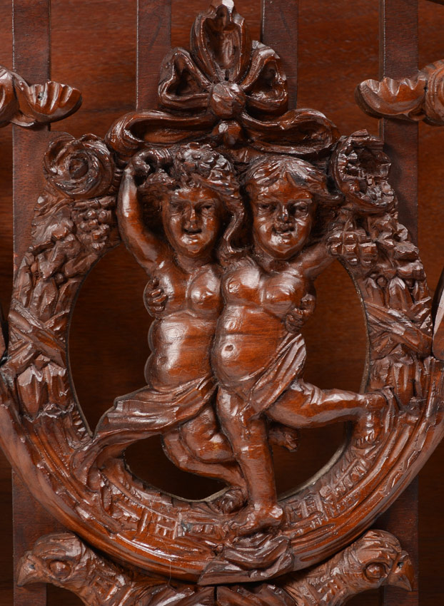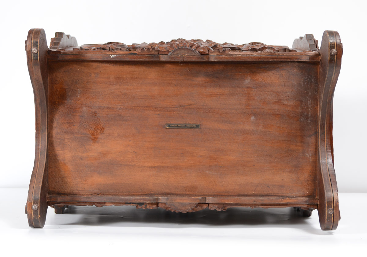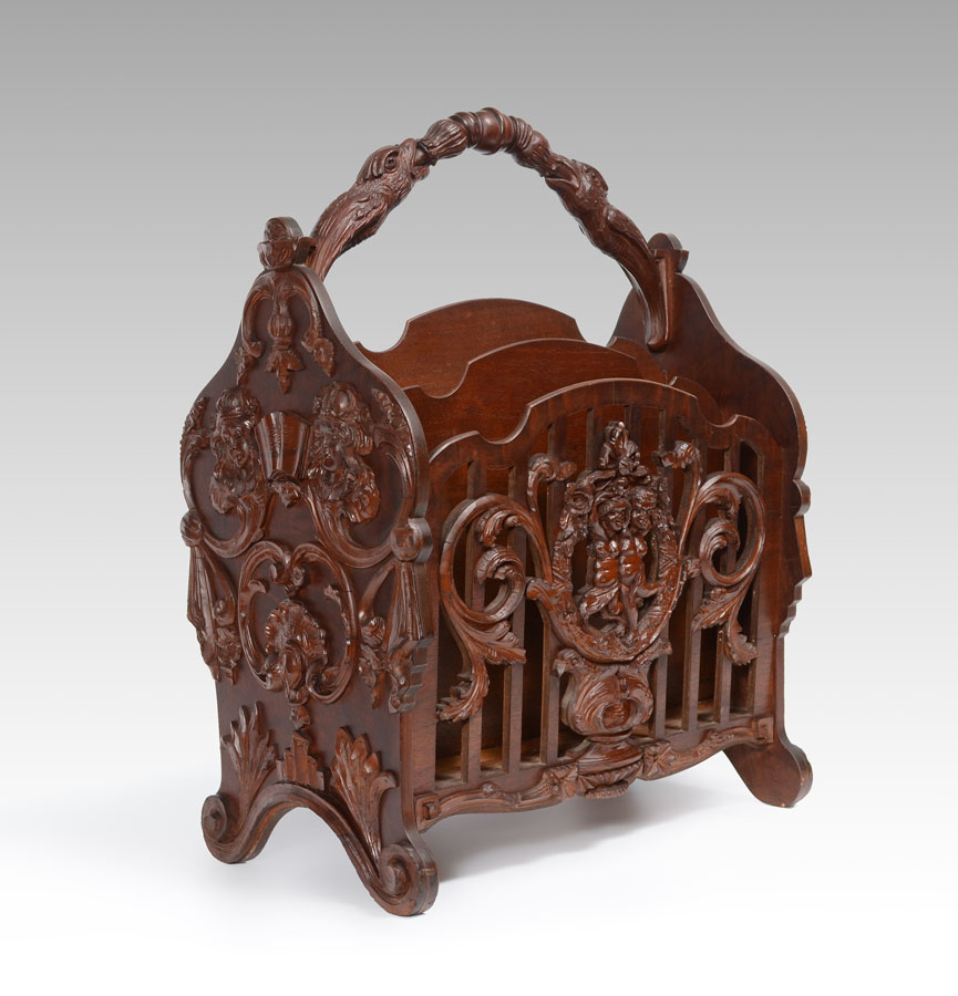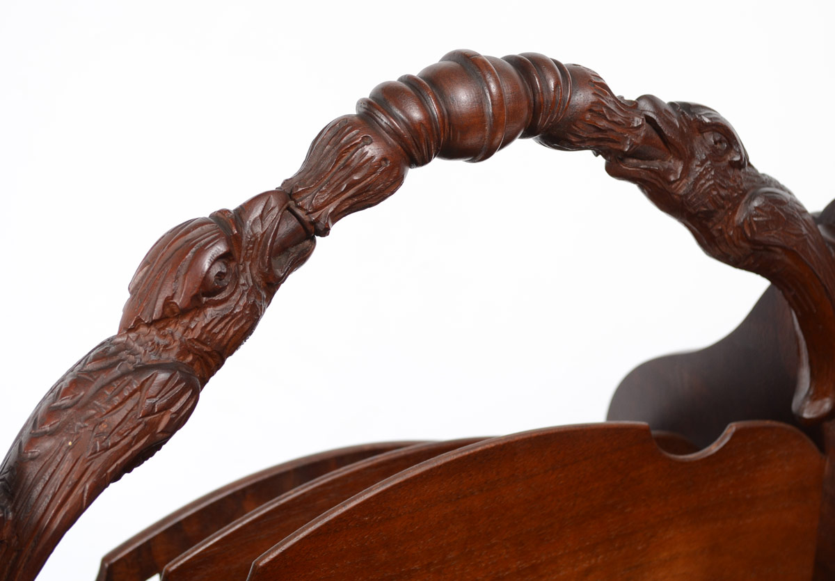 FIGURAL CARVED VICTORIAN CANTERBURY: Handle with figural eagle heads, sides with figural putti and foliate scroll, sides with applied masquerons and foliate scroll. 4 divided sections for magazines. Measures 26 1/2'' h. x 20'' x 13 3/4''.