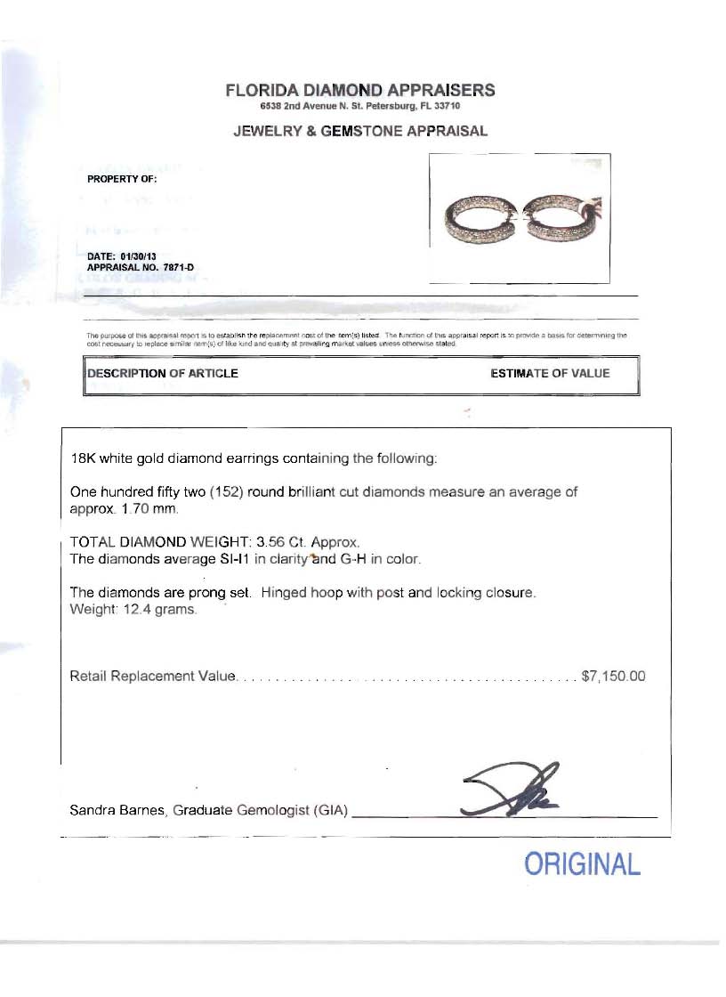 3.56 CTW DIAMOND HOOP EARRINGS: 18K white gold hinged hoop earrings of 152 round brilliant diamonds totaling approx. 3.56 Ct., averaging SI-I1 clarity and G-H color. Prong set. Post and locking closure. Diameter; .75''. Weight: 12.4 grams. Sold with current Florida Diamond Appraisers GIA graduates appraisal for $7150.