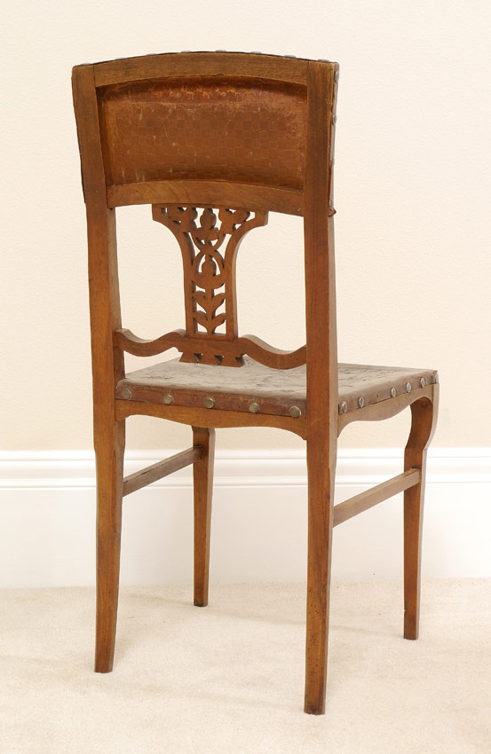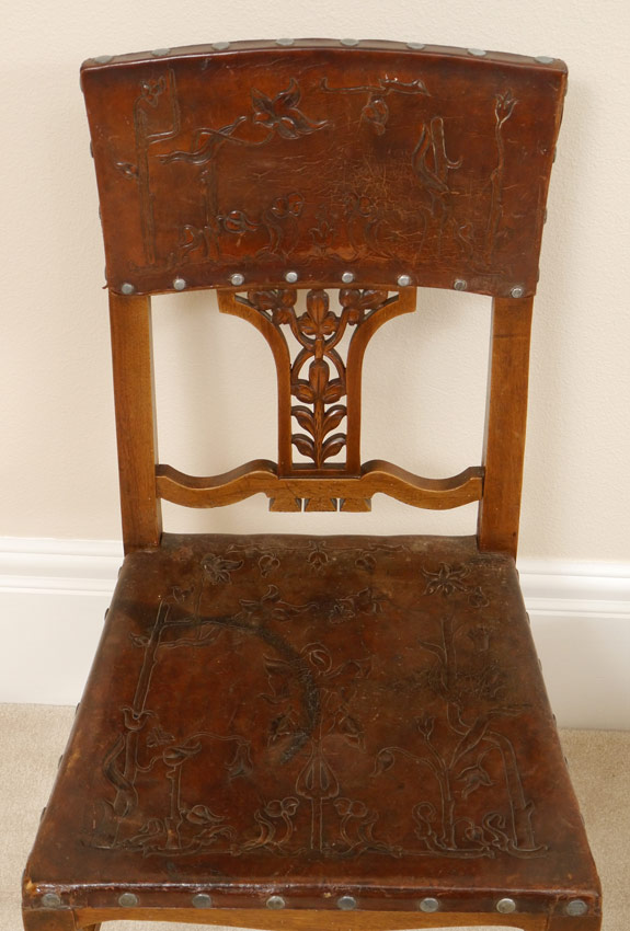SET OF 6 GERMAN EMBOSSED LEATHER CHAIRS: Embossed tacked leather backs and seats with foliate motifs, carved and open work back splat, shaped legs. German paper labels under seats. 38''h. x 19'' x 19''.