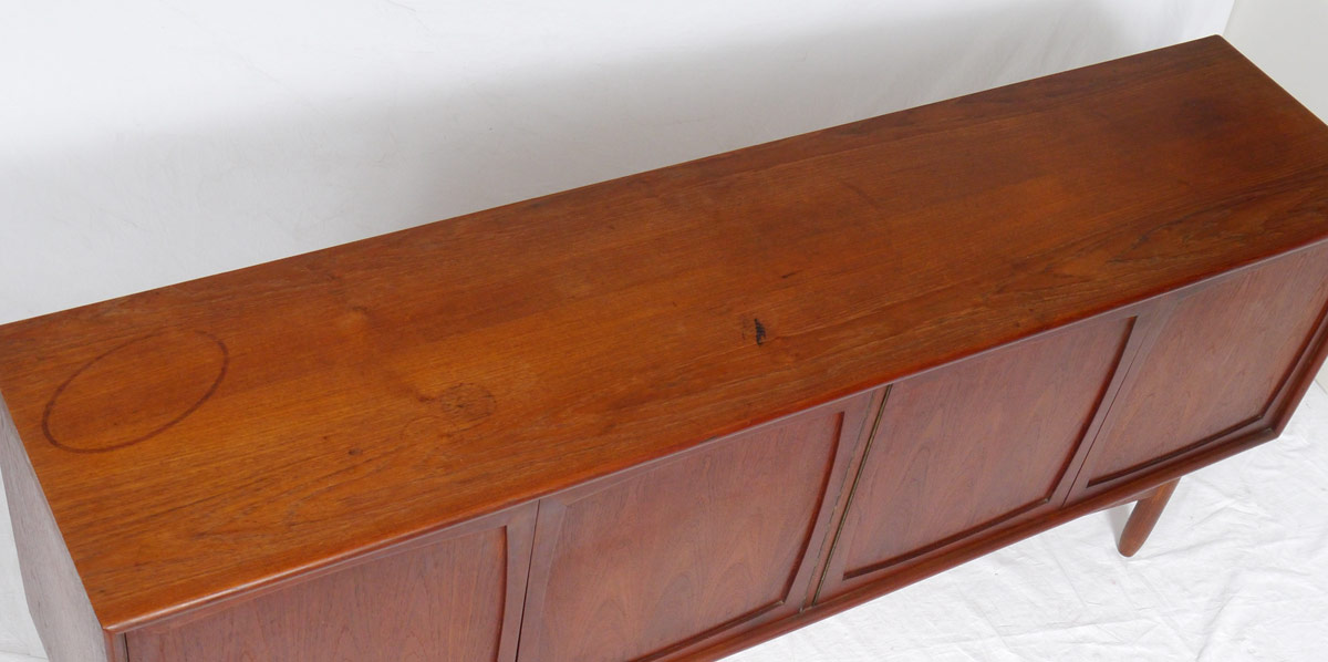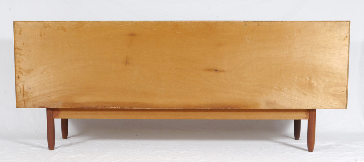 MID CENTURY TEAK CREDENZA: 4 doors with 2 internal drawer on 4 legs. Classic mid century design, unmarked as to maker. 29'' h. x 72'' x 16 3/4''.