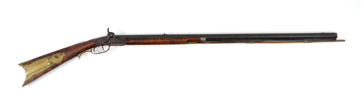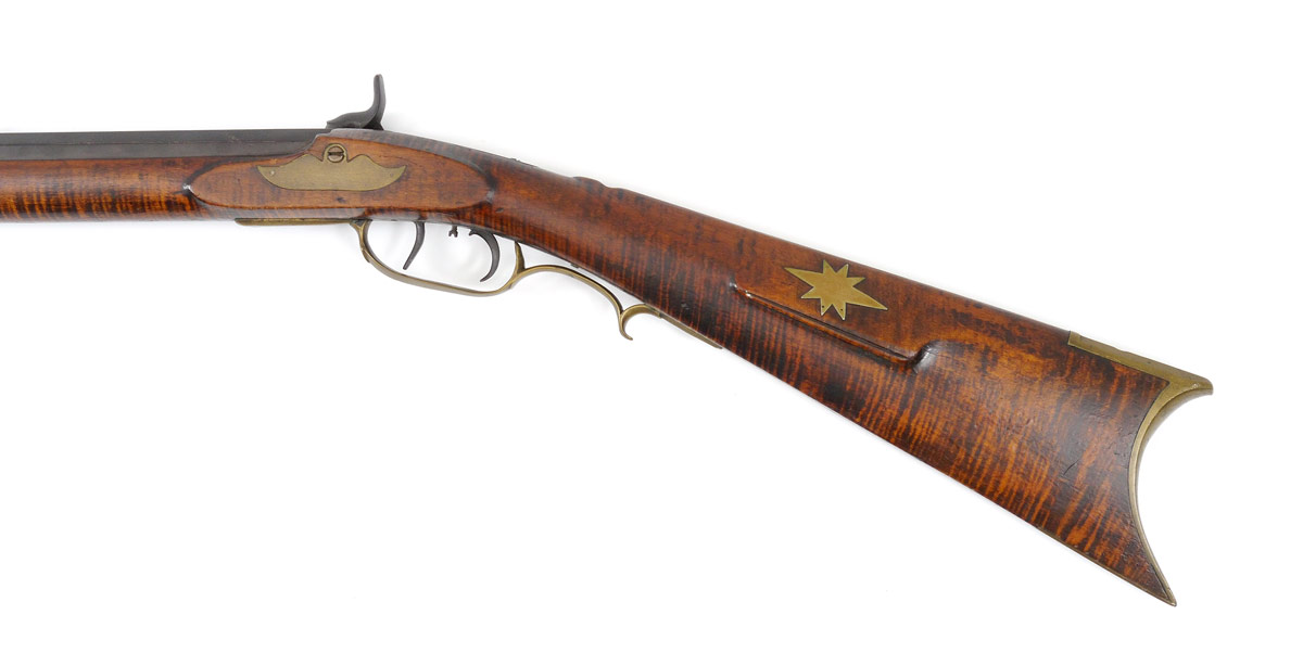 HALF STOCK PERCUSSION KENTUCKY RIFLE: Circa mid 19th century, unmarked 35 1/4'' octagon barrel, unmarked engraved percussion lockplate. Tiger maple half stock with inset brass patchbox and star decoration. Action currently does not hold. Overall 50'' in length.