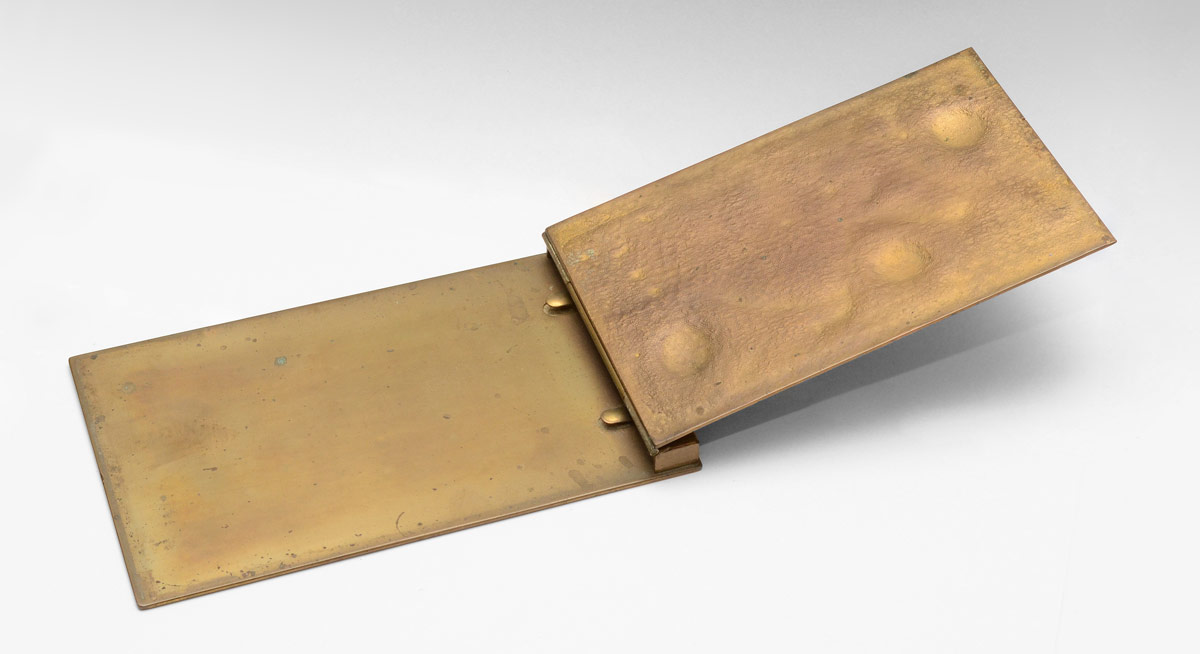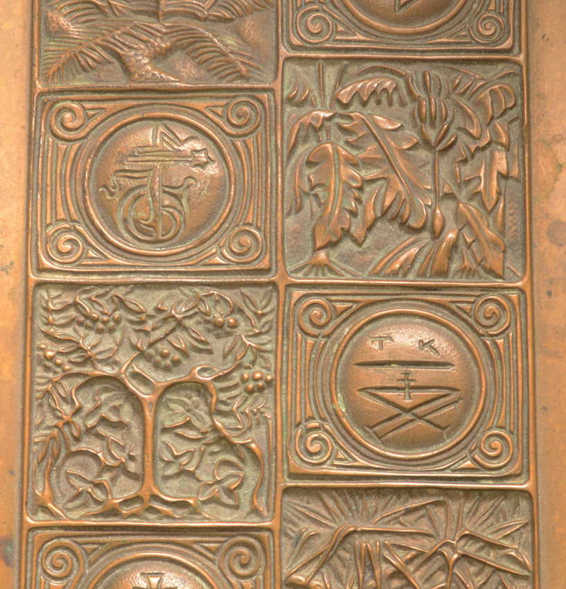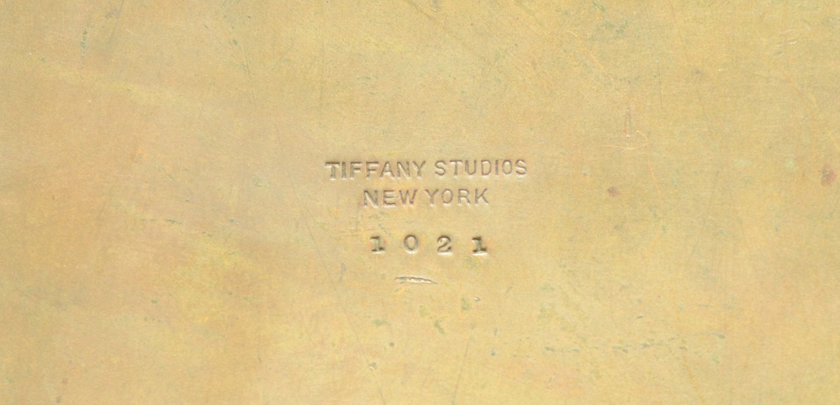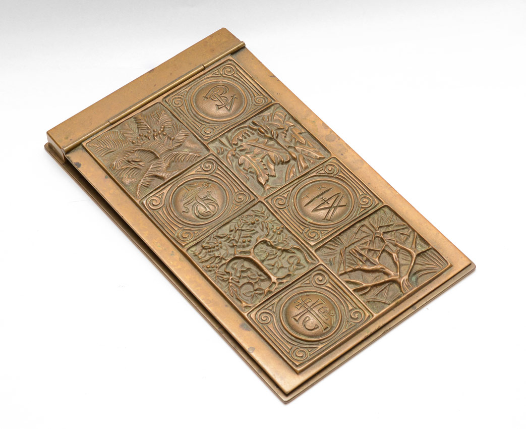 TIFFANY STUDIOS BOOKMARK BRONZE PAD HOLDER: Pad holder in the ''Bookmark'' pattern, marked Tiffany Studios, New York, 1021. 7 5/8'' x 4 3/4''.