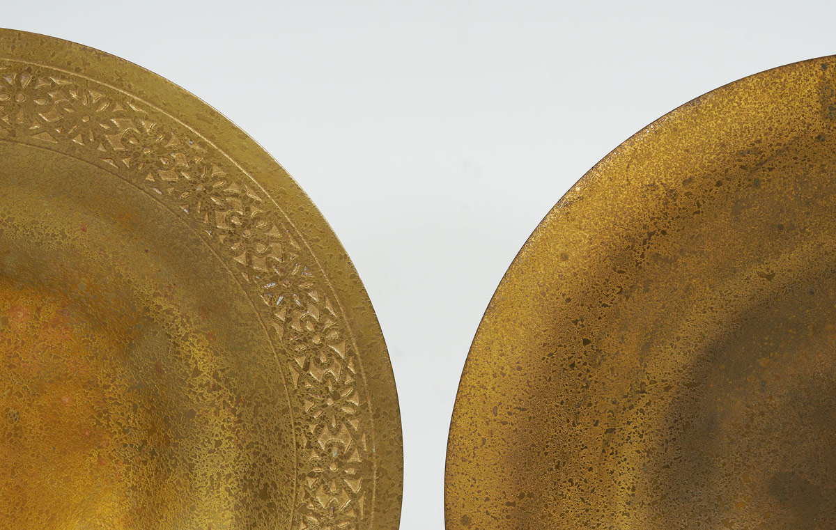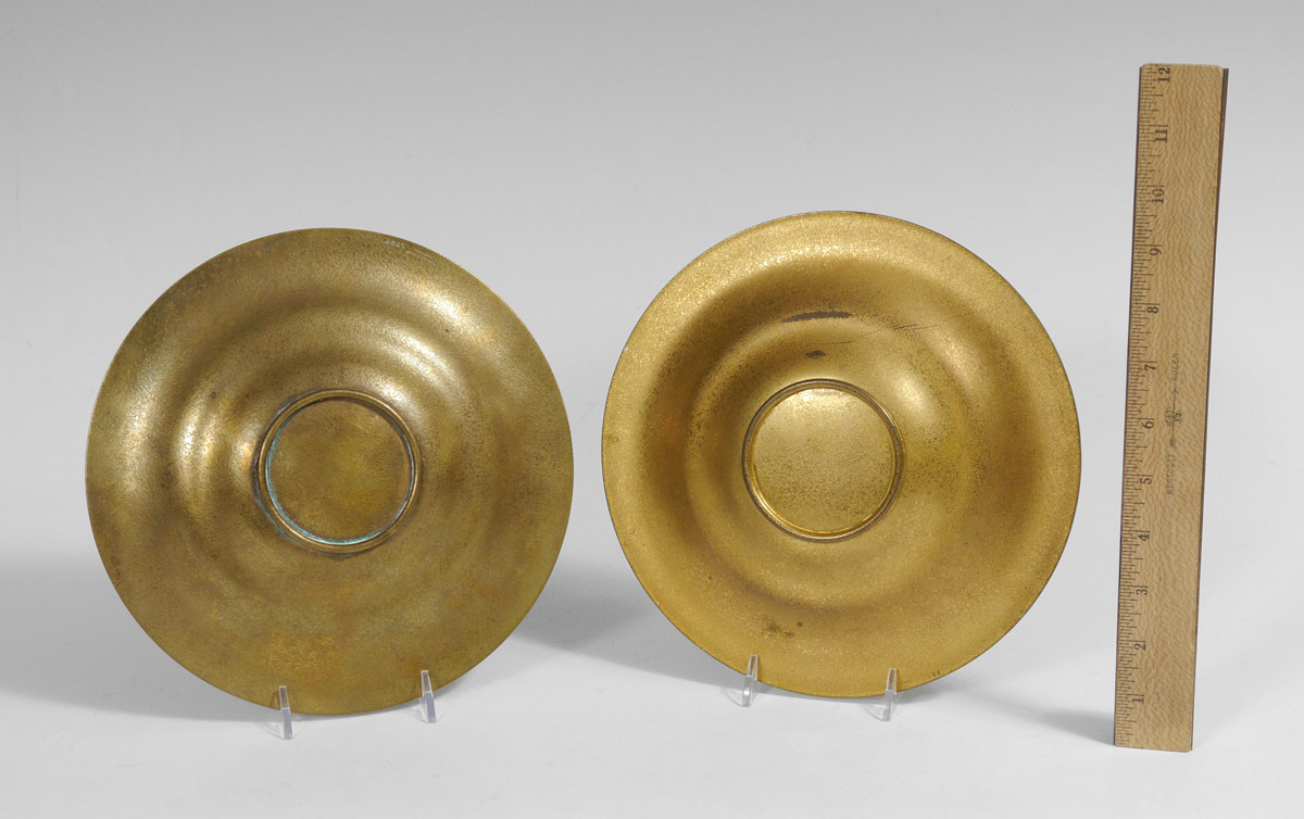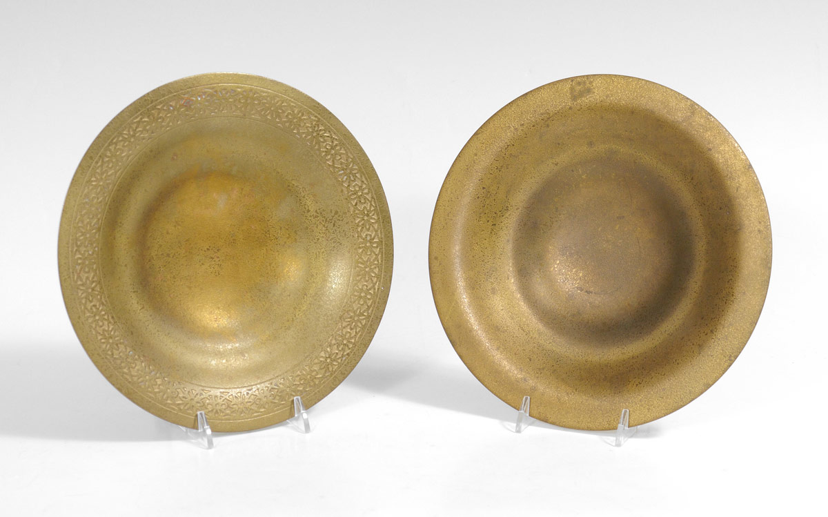 2 TIFFANY STUDIOS GILT BRONZE BOWLS: 2 pieces total to include 1) Marked Tiffany Studios, New York, 1707, embossed rim, 9'' dia. 2) Marked the same, #1708, 9'' dia.