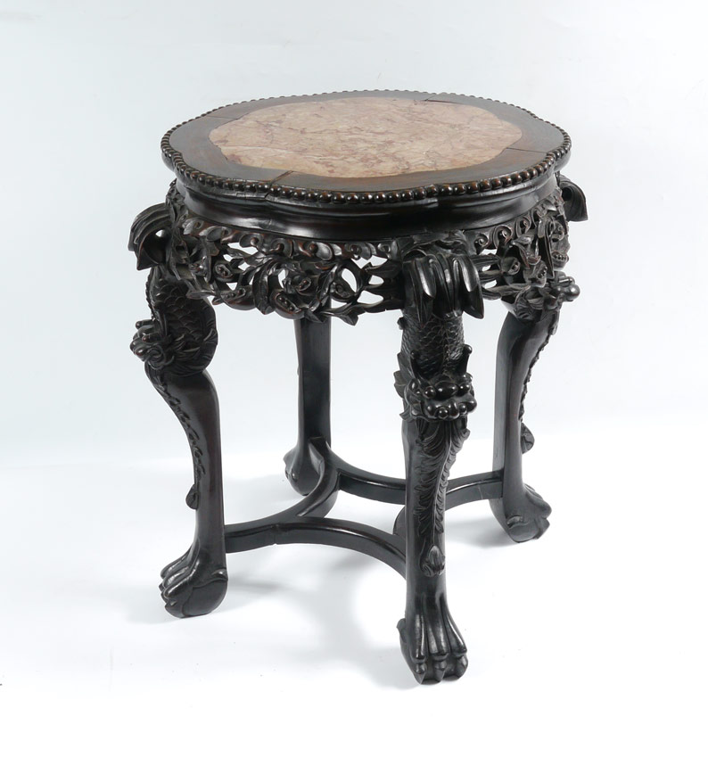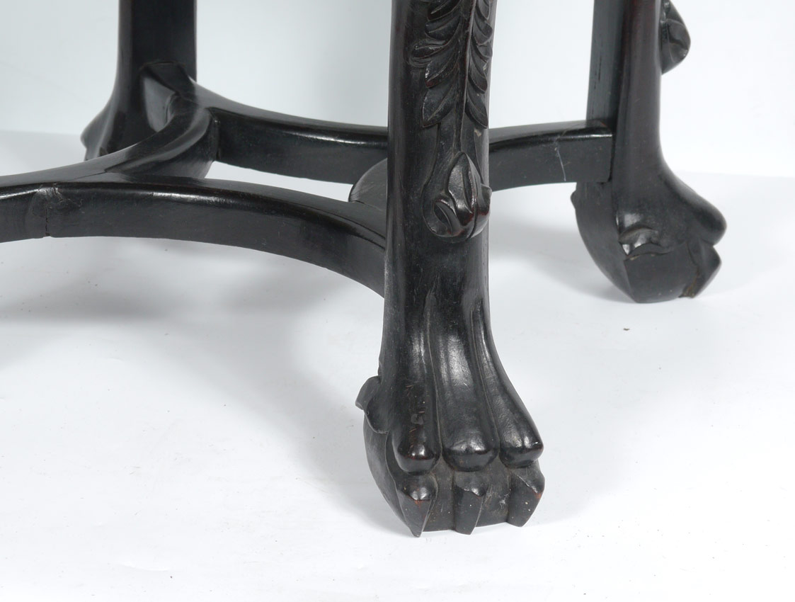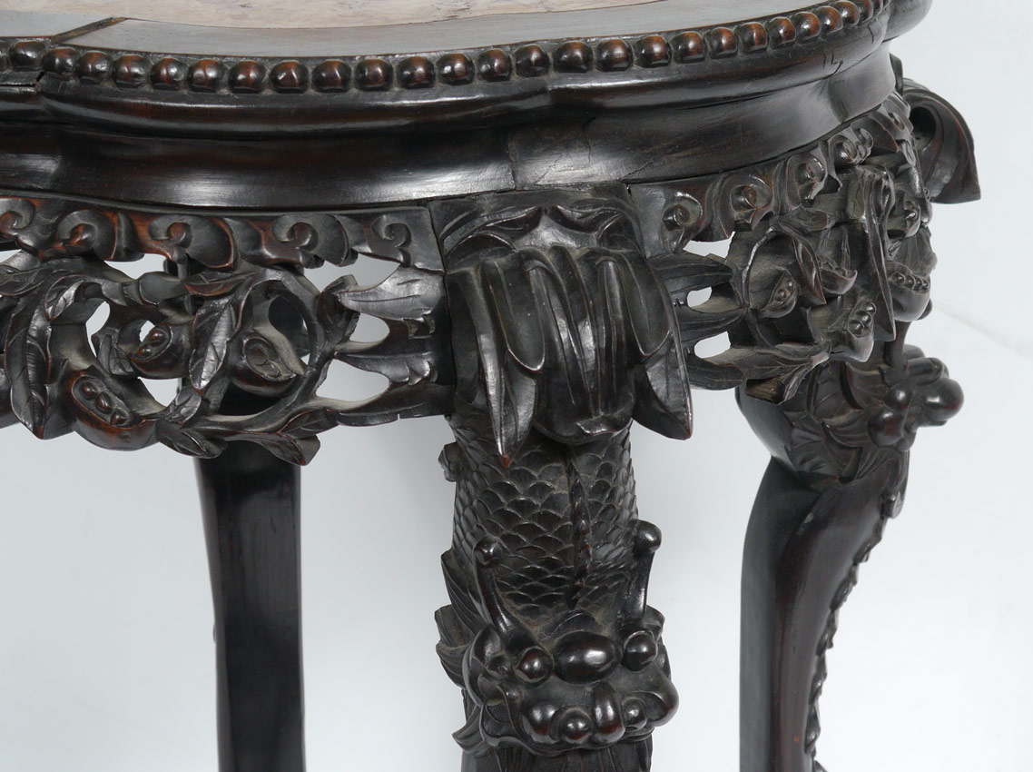 CHINESE MARBLE TOP STAND: Recessed marble top framed in carved beading, pierce carved skirt, figural legs ending in claw feet. Measures 22 1/2'' tall x 18'' dia.