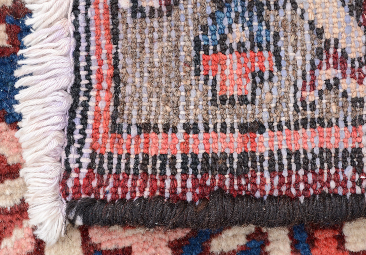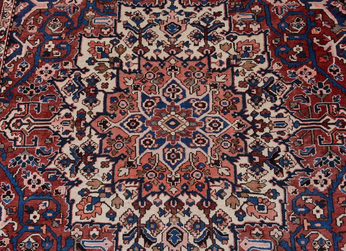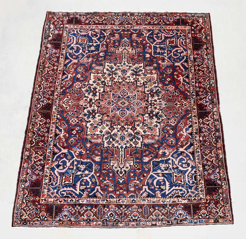 SEMI-ANTIQUE PERSIAN HERIZ HAND KNOTTED WOOL RUG, 10'3'' x 12'1'': This Heriz has a traditional format of many rugs of its type with a central medallion, this one white, blue, and salmon, on a deeper salmon colored field that also has blue quarter medallions in the corners. The darker colored border of the rug completes the picture. This attractive rug would go well in a family room or den. Condition is good.