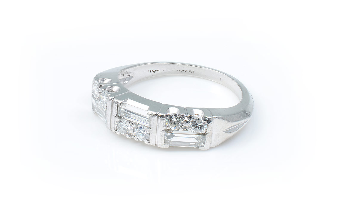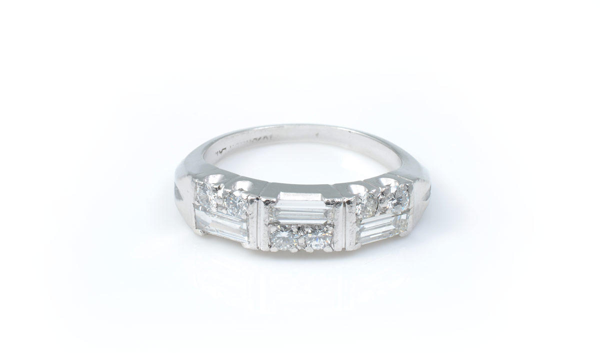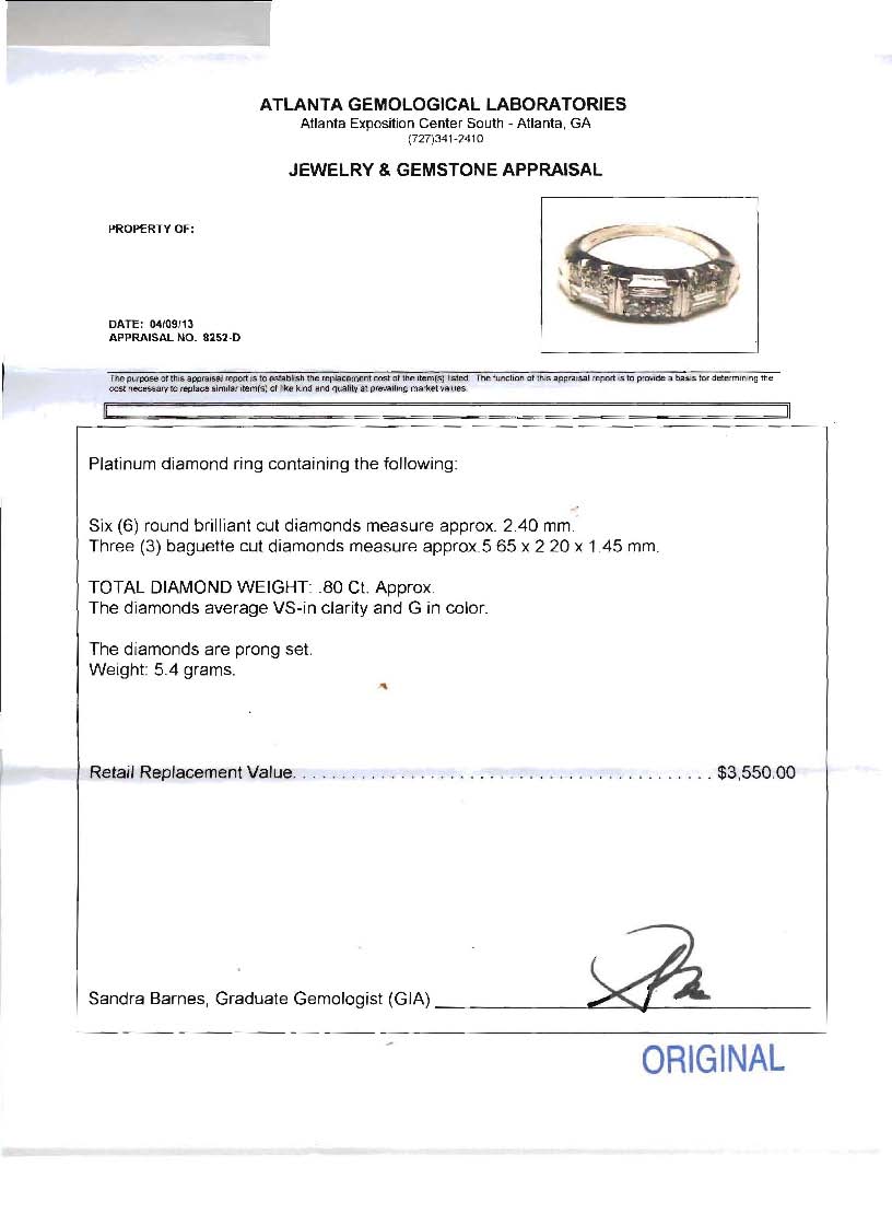 PLATINUM ART DECO STYLE DIAMOND RING: Six round brilliant and three baguette diamonds illuminate this platinum ring. Diamonds total approx. .80 Ct., clarity is VS and color G. Size 6. Weight 5.4 grams. Sold with current Atlanta Gemological GIA graduates appraisal for $3,550.