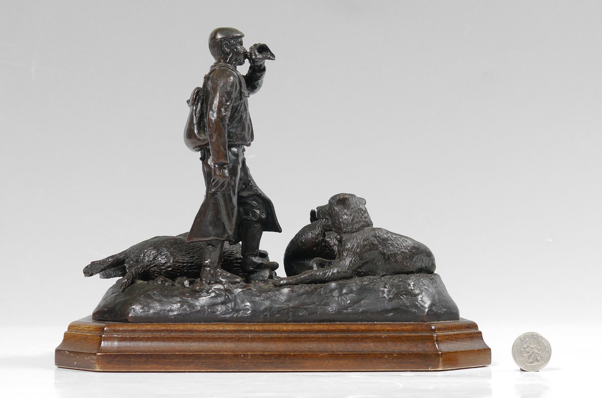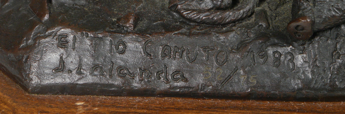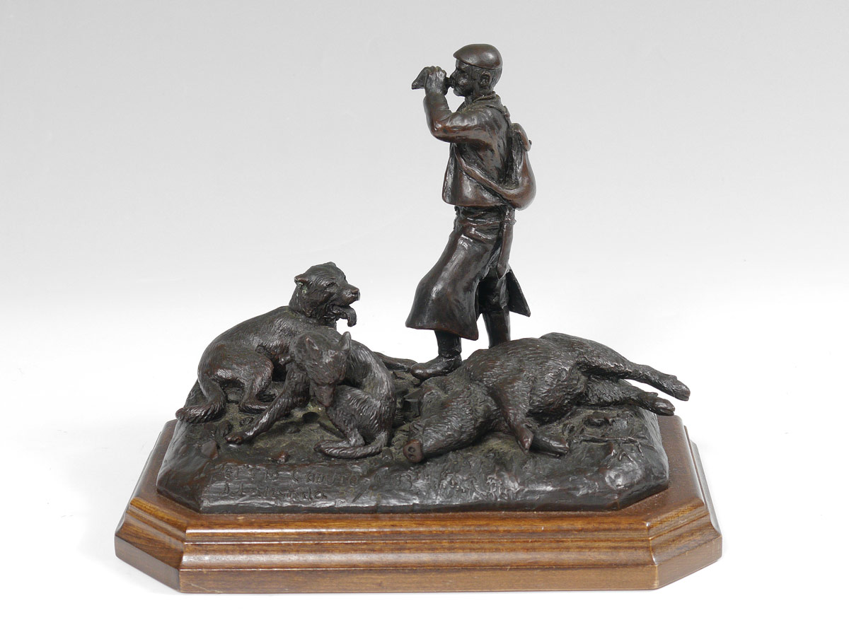 LALANDA, Josechu, (Spanish, 1939- ): ''El Tio Canuto'', Depicts a Figural Grouping of Hunter and Dogs with Downed Boar, 7 3/4'' h. x 10'', incised title and signature, dated 1983, #'d 52/75, affixed to beveled wooden plinth.