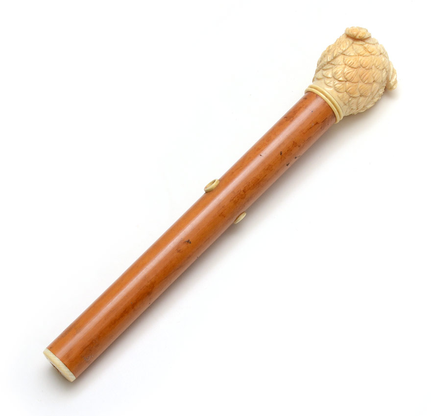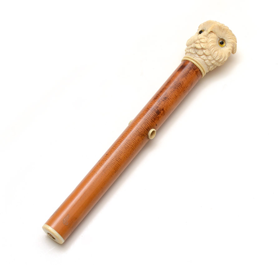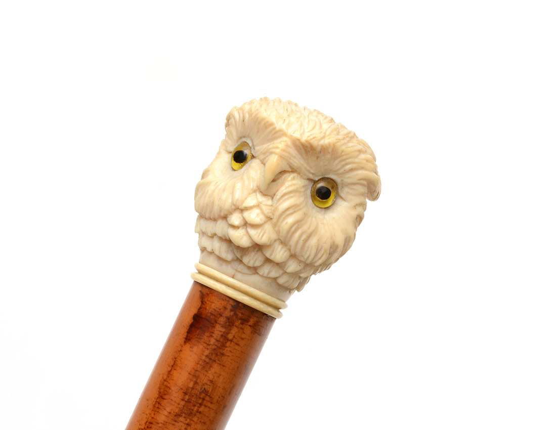 CARVED IVORY OWL PARASOL HANDLE: Pommel in the form of a carved figural owl head, wood shaft with ivory collar and lanyard hole. Glass eyes. Measures 8'' long.