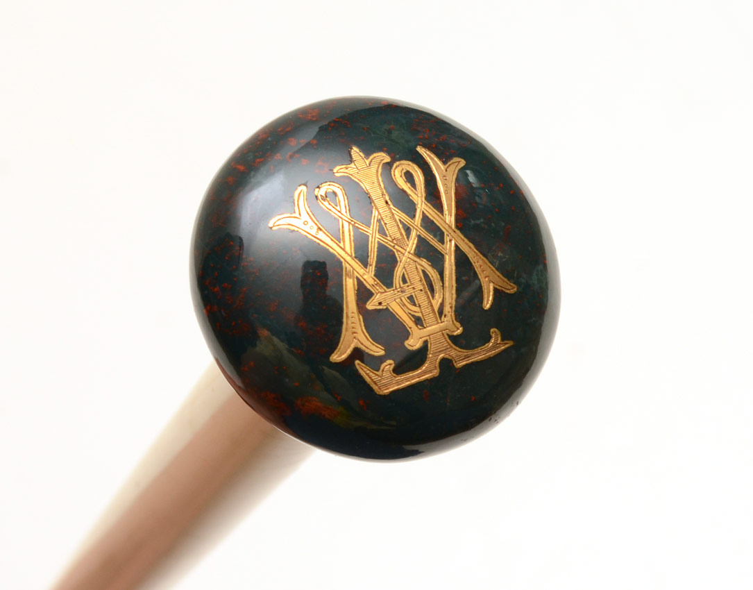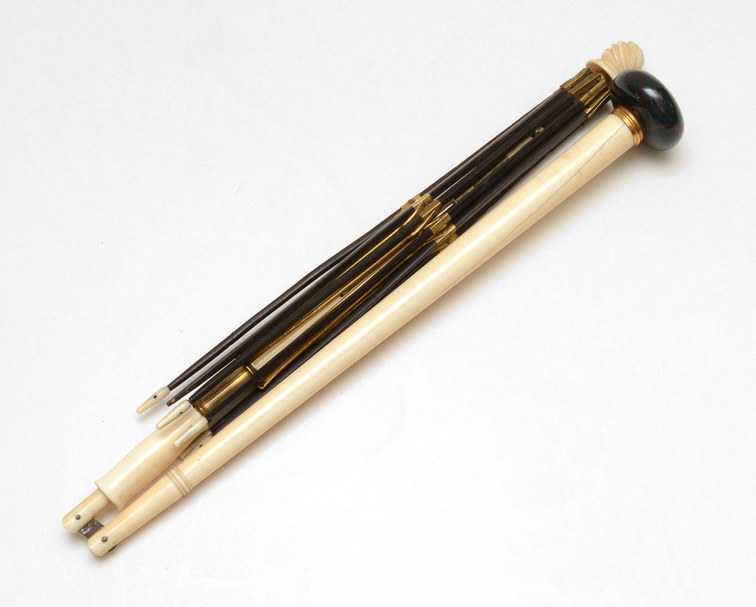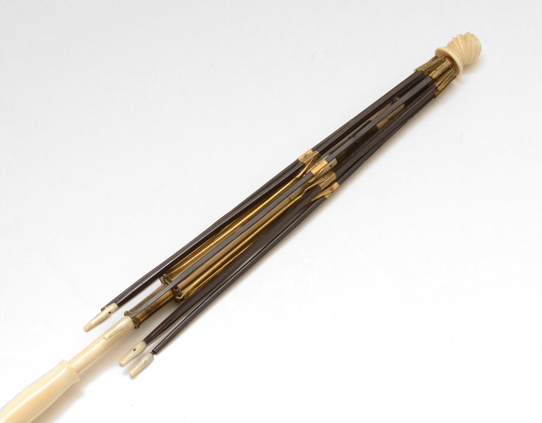VICTORIAN PARASOL WITH IVORY SHAFT: Monogrammed stone handle, folding ivory shaft and frame for parasol. Shaft hinged at middle, carved ivory finial. Measures 24 1/2'' long overall, 12 1/2'' folded.
