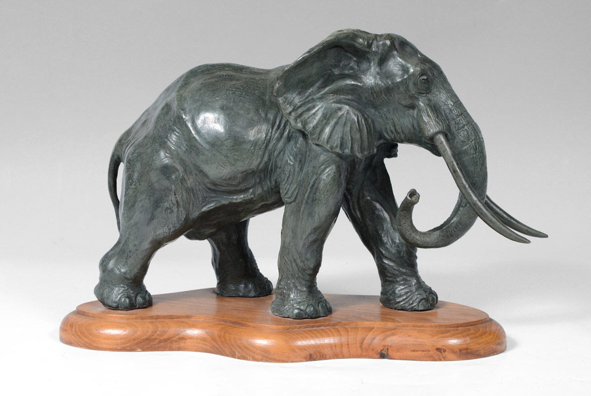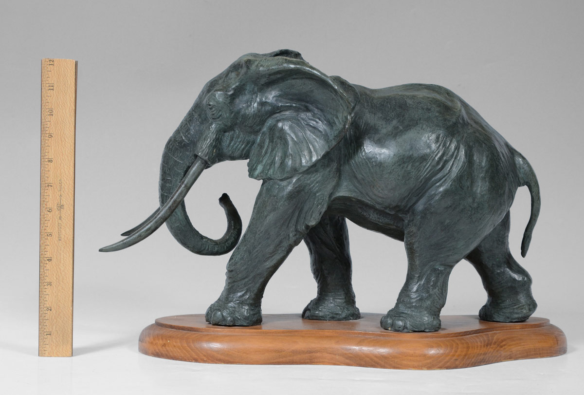 LARGE BRONZE ELEPHANT BY MARTI: Signed P. Marti, 11'' h., affixed to beveled wooden plinth, 12 1/2''h. x 19'' x 9'' approx. overall, Francisco Marti stamp to the wooden plinth underneath.