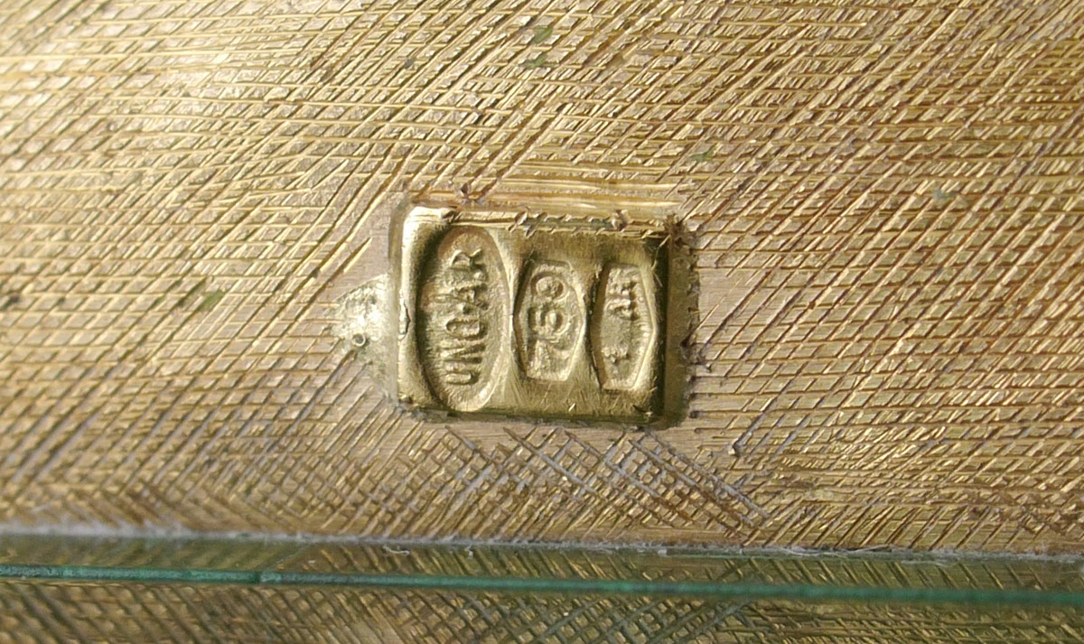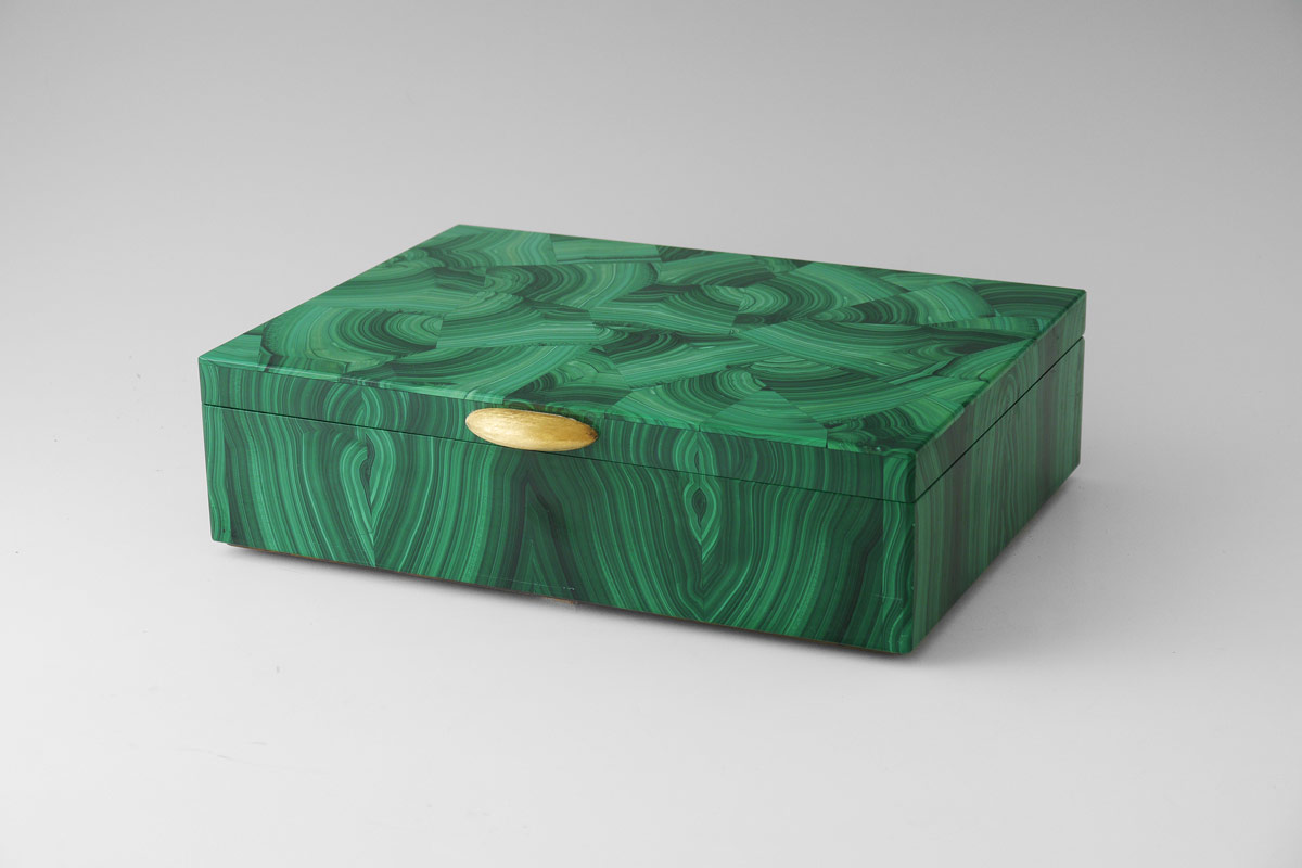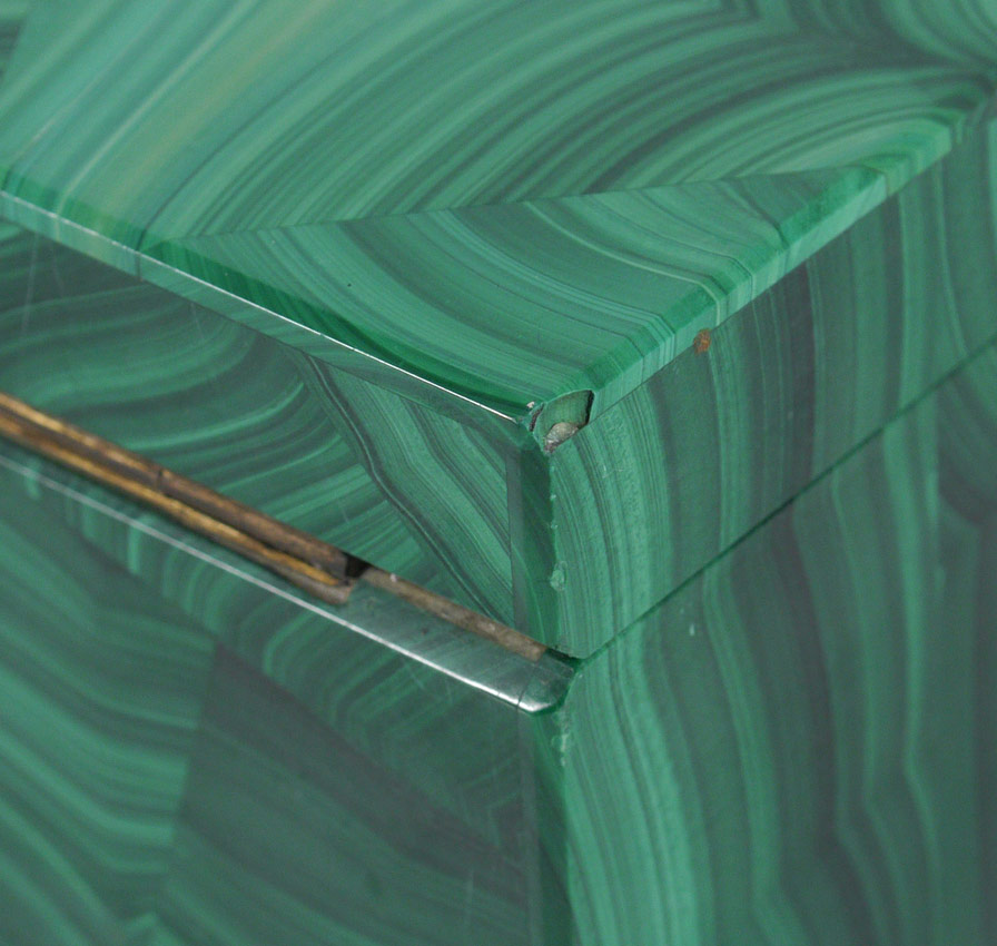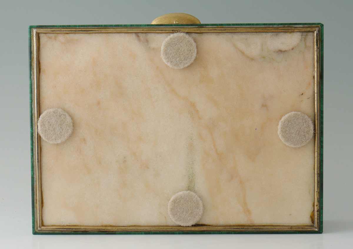 UNO A ERRE ITALIAN MALACHITE AND GOLD HANDLE BOX: Beautiful matched and mosaic patterns of malachite with rose marble interior and base. Gold handle marked .750 UNO-AR, 1-AR. Silver bottom frame marked .800 fine, 1-AR. 2 1/4'' x 8 5/8'' x 6 1/4''. Note: UNO-ERRE founded on March 15, 1926 by Leopoldo Gori and Carlo Zucchi, the two ''fathers'' of the first goldsmith company in the city of Arezzo, which had the original idea to apply industrial methodologies to the goldsmith's art. The name UnoAErre comes from the ''1 AR'' identification mark indicated on the punch touchmarks on UNO-ERRE pieces. 1-AR was assigned to the first goldsmith company of Arezzo (AR).