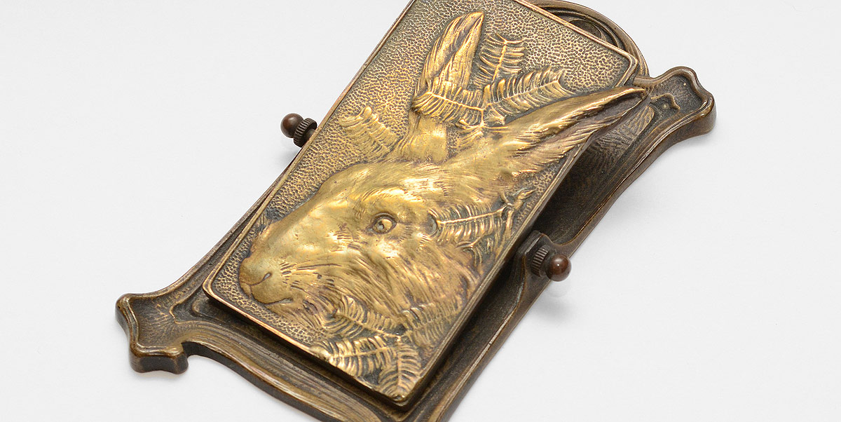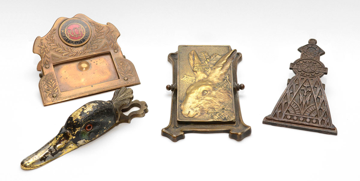 4 ANTIQUE DESK CLIPS: 4 pieces total to include 1) Bronze clip with figural rabbit head on top, 1'' h. x 5 1/4'' x 3''. 2) Painted figural duck head clip with glass eyes. 1 1/8'' h. x 5'' x 1''. 3) RCA Photophone High Fidelity Sound clip, 1 3/4'' x 3 5/8'' x 3 3/4''. 4) Clip with cast design, 1'' h. x 4 3/8'' x 2 5/8''.