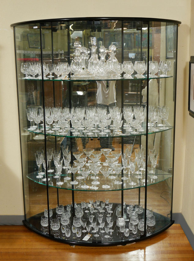 CONTEMPORARY BOW FRONT GLASS DISPLAY CABINET: Illuminated interior, glass shelves, mirror back. 74'' h. x 58'' x 18''