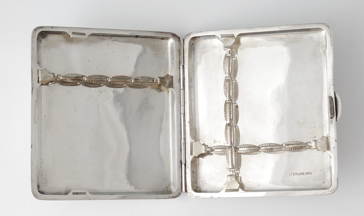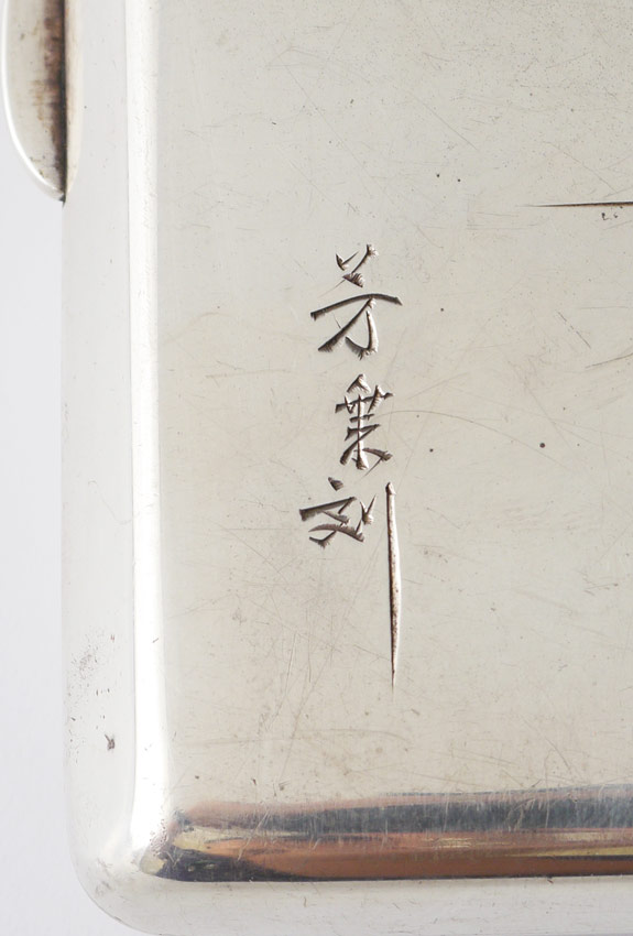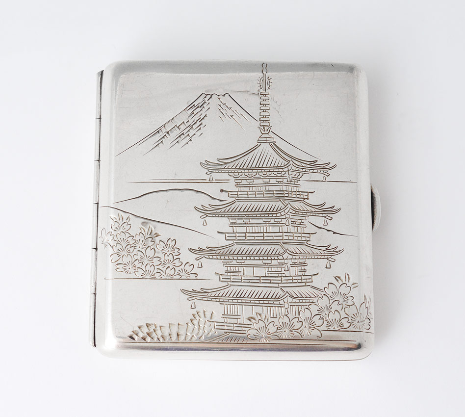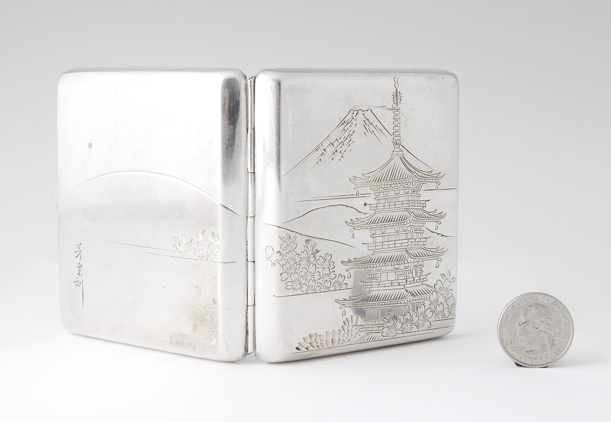 ENGRAVED JAPANESE STERLING SILVER CIGARETTE CASE: Engraved with pagoda and Mt. Fuji front, signed on back. Marked Sterling 950 inside. Measures 3 3/4'' x 3 3/4''. Approx. 4.0 troy oz.
