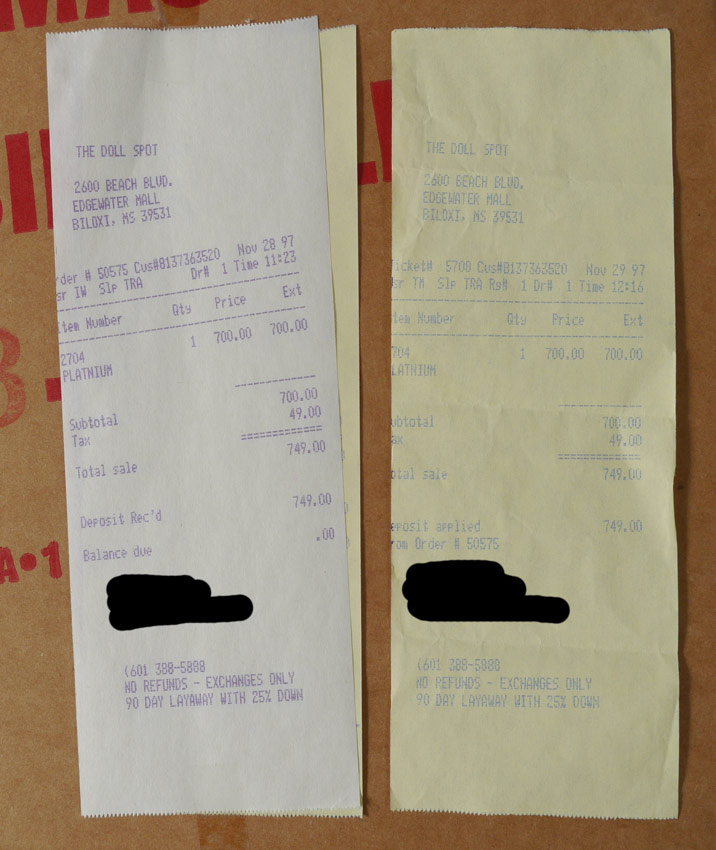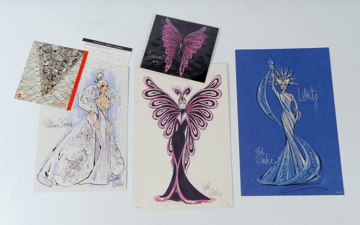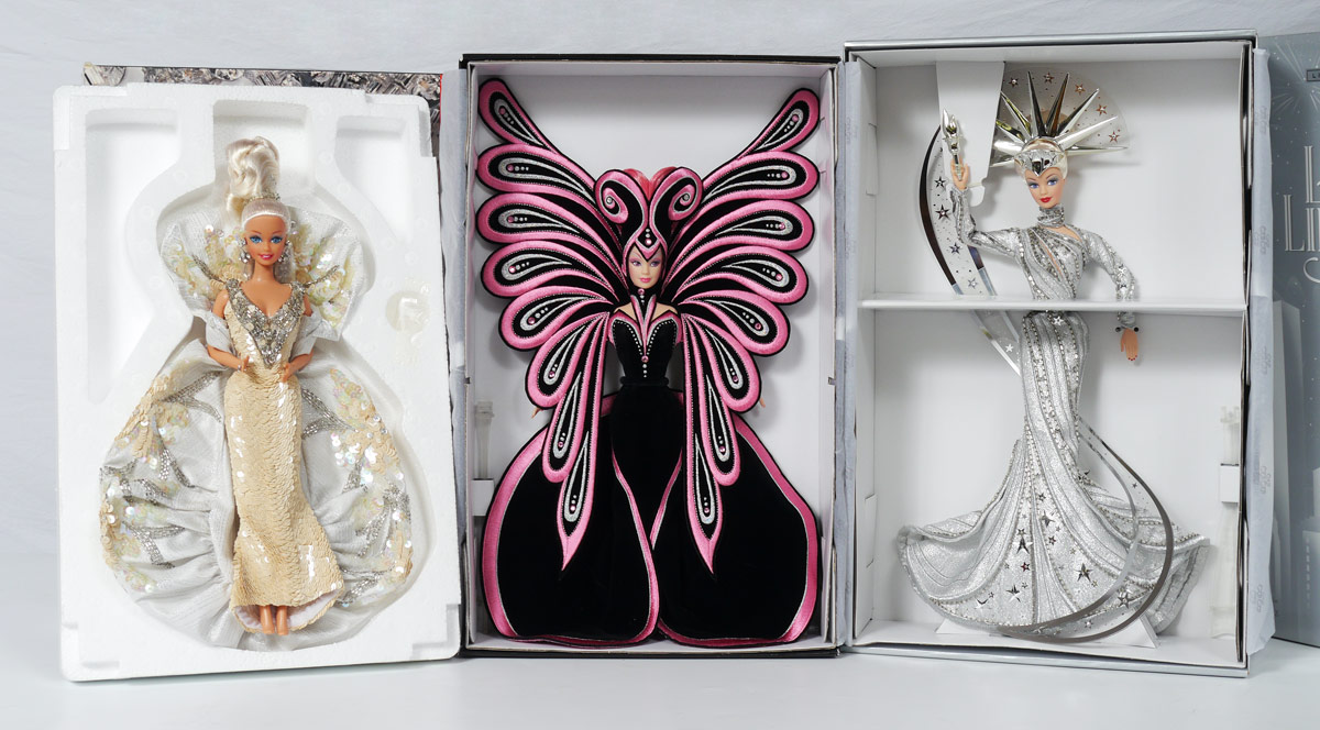 3 BOB MACKIE DESIGNED BARBIE DOLLS: New in the boxes , one with the original $700 receipt of payment. Highly detailed costumes. The dolls are named Platinum, Papillon, and Lady Liberty. Boxes measure 16'' x 10 1/2'' x 4 1/2''.