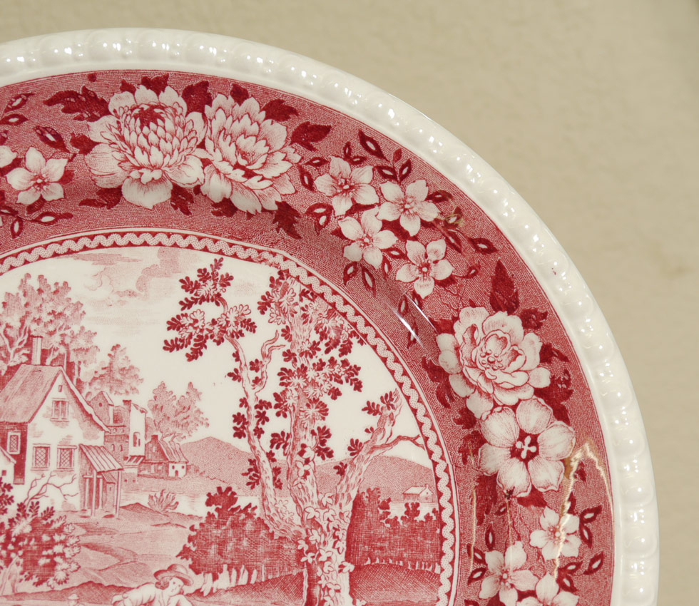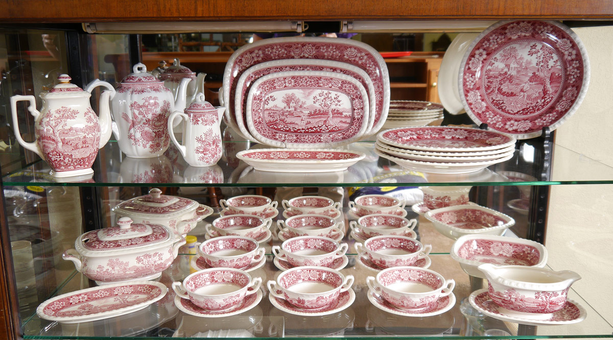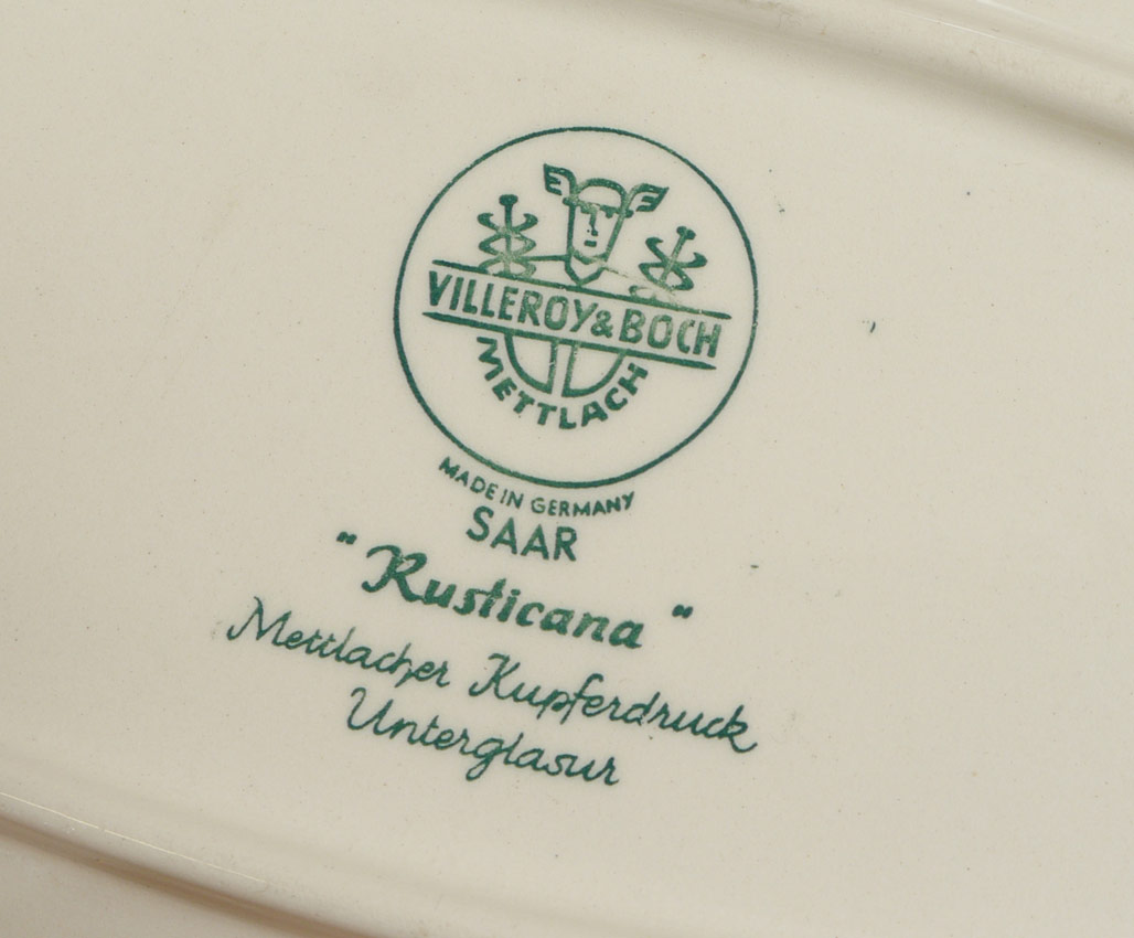 VILLEROY & BOCH RED RUSTICANA DINNERWARE: 26 pieces to include tureen, square vegetable, gravy boat, teapot, 3 platters (10-14''), 5 dinner plates (10''), 6 cream soups with saucers. Sold with a coffee pot and creamer in the Fason pattern.