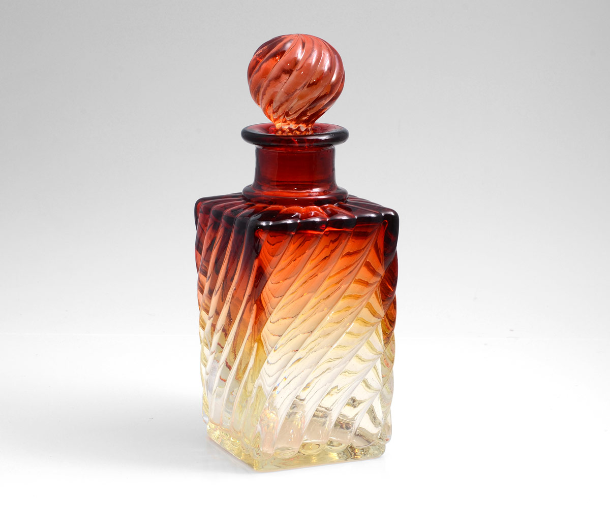 BACCARAT AMBERINA ROSE DECANTER: Swirl glass square form with round stopper. Unsigned. 8'' tall.