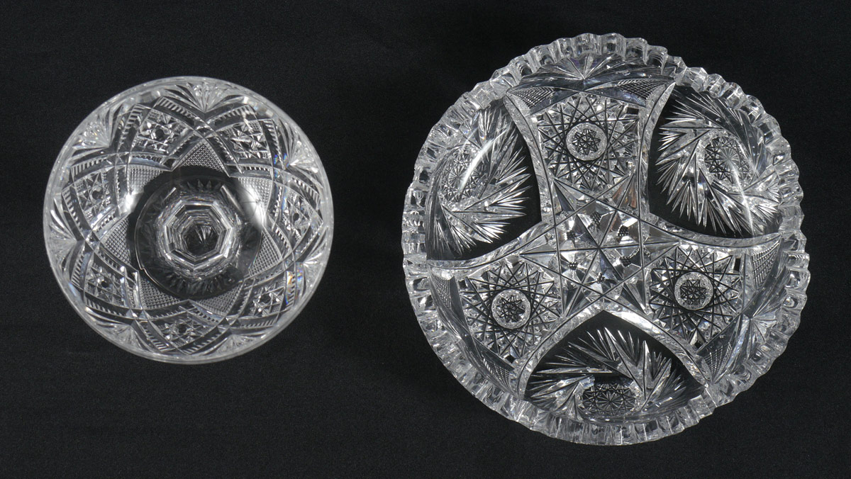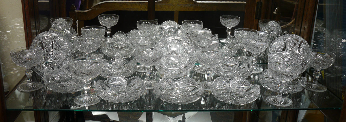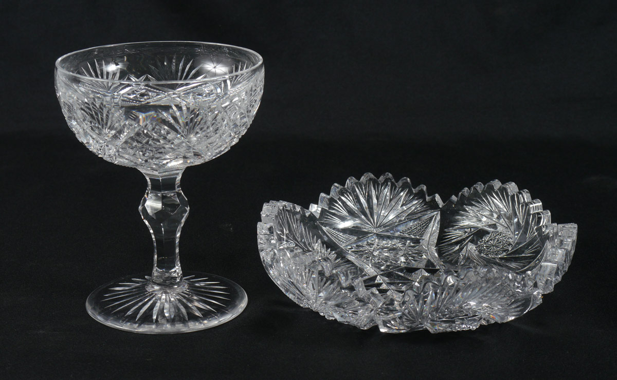 AMERICAN BRILLIANT CUT GLASS: Set of 10 ice cream dishes, 6'' dia. Sold together with a set of 10 sherbert champagne stems, 4 3/4'' tall.
