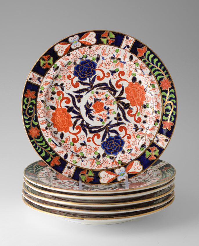 ROYAL CROWN DERBY PLATES IN IMARI COLORS: 6 Plates in pattern #524, 8 3/4''.
