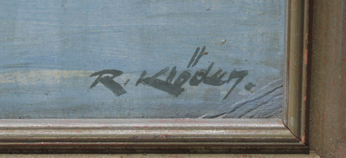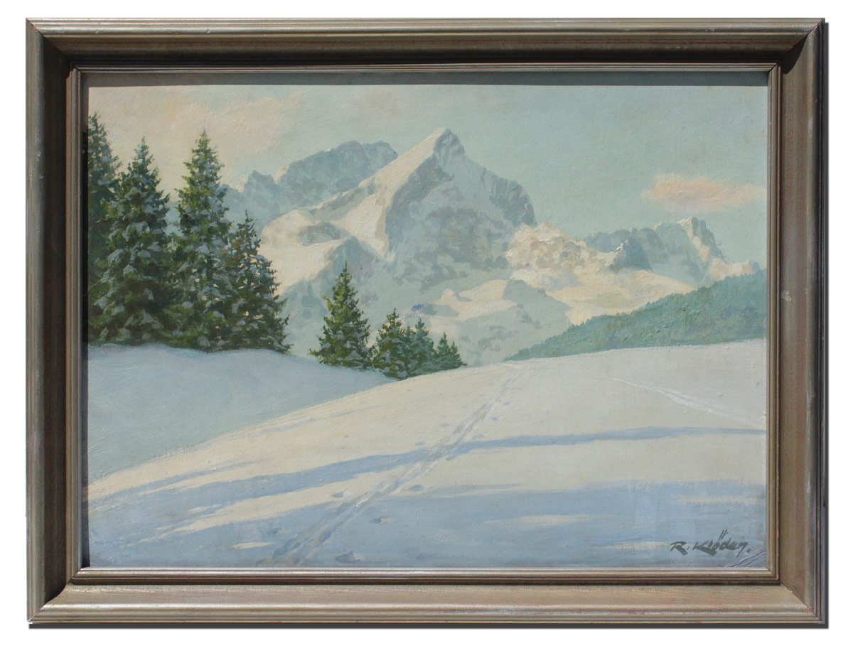 ILLEGIBLY SIGNED GERMAN SNOWY LANDSCAPE PAINTING: Scene Depicts Snow Capped Mountains in the Distance with Footprints and what looks like a Cross Country Ski Trail in the Snow, Oil/Board, 14 1/2'' x 20'', signed lower right R. Kloder?, silver frame 17'' x 22 1/2''.