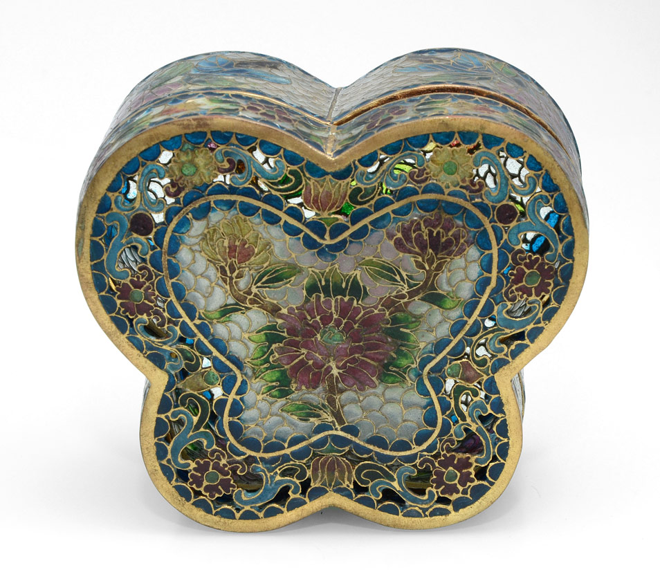 CHINESE PLIQUE A JOUR GROUP: 3 pieces to include two ducks (approx. 3 1/2'' x 5'' long), and a covered box (1 1/2'' tall x 3''). Measurements do not include the wood stands.